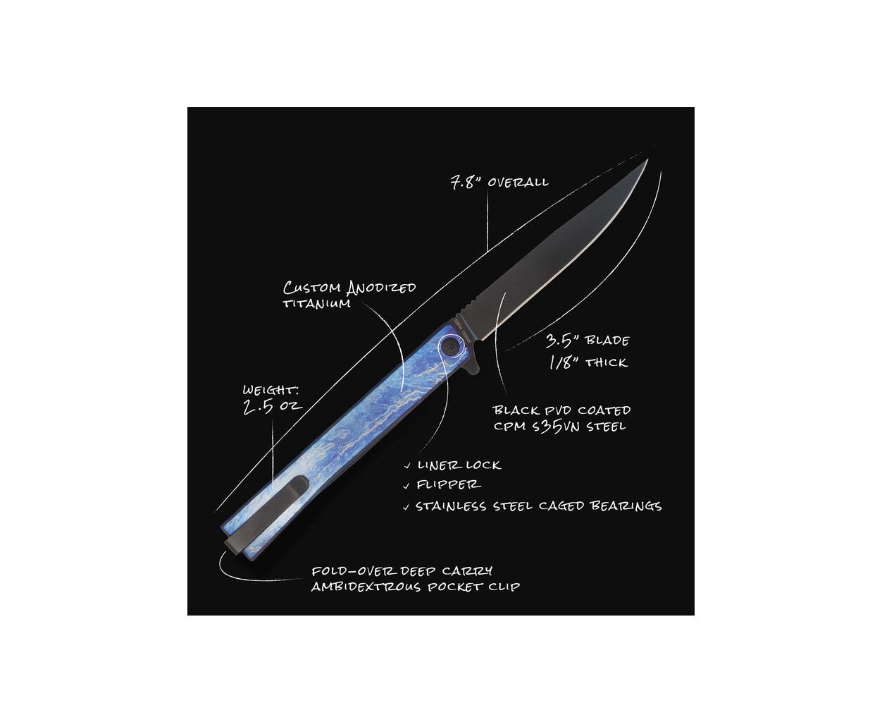 Нож Ocaso Titanium Solstice теперь доступен в уникальной анодированной обработке, которая выводит эту и без того невероятную модель на новый уровень. Изготовлен в небольших количествах с использованием "энтропического" стиля анодирования, со сложными случайными узорами и яркой окраской, чем вызывает образ молнии или искусственности, идеален для туманности. коллекционеров или тех, кто хочет чего-то действительно особенного для повседневной носки.