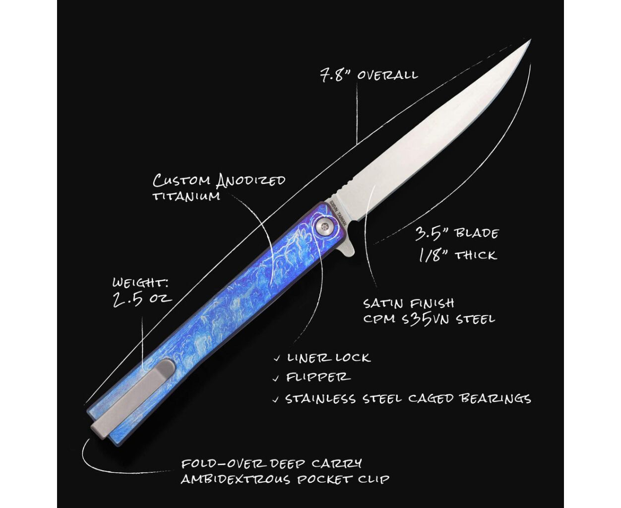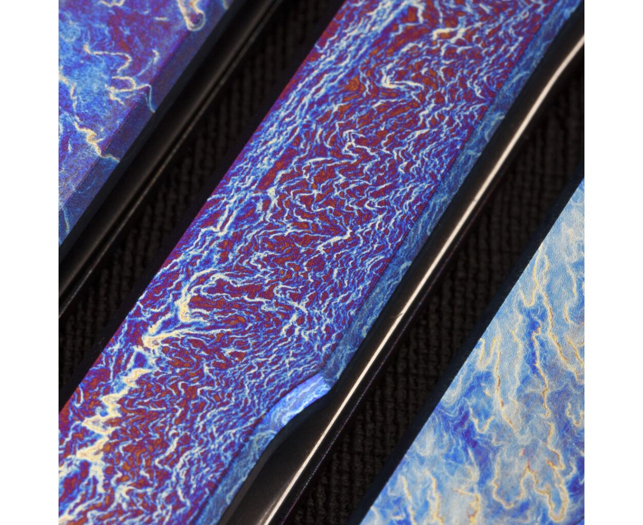 Нож Ocaso Titanium Solstice теперь доступен в уникальной анодированной обработке, которая выводит эту и без того невероятную модель на новый уровень. Изготовлен в небольших количествах с использованием "энтропического" стиля анодирования, со сложными случайными узорами и яркой окраской, чем вызывает образ молнии или искусственности, идеален для туманности. коллекционеров или тех, кто хочет чего-то действительно особенного для повседневной носки.