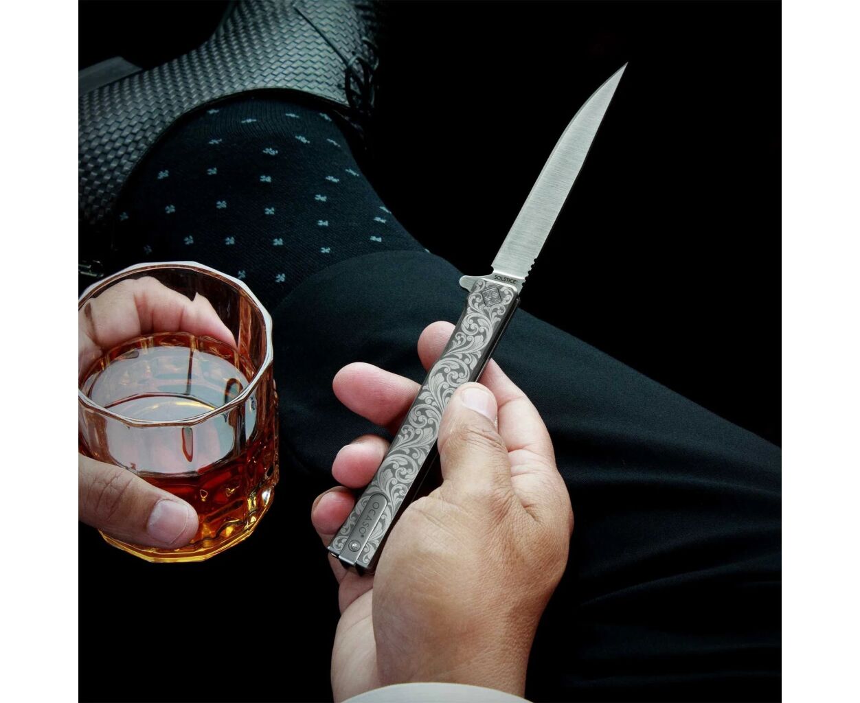 Описание Нож Ocaso Solstice, Engraved titanium, Scroll Pattern, Satin (10ESS)