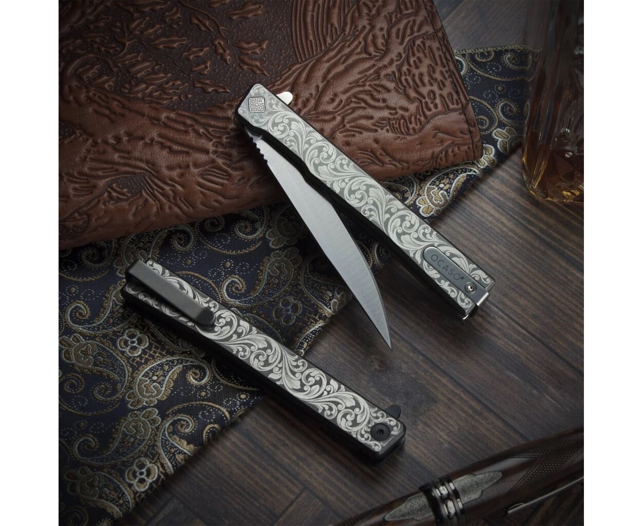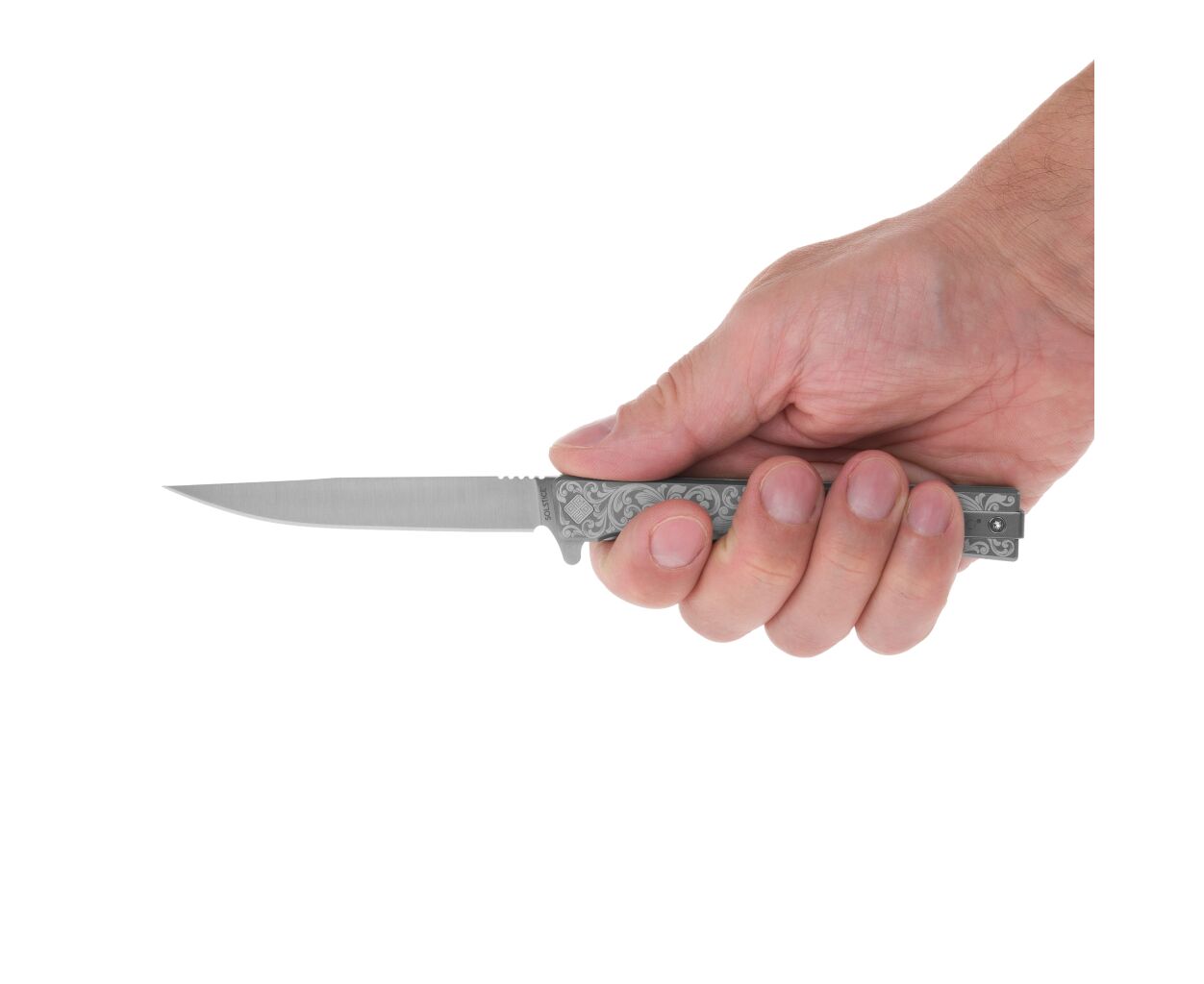 Нож Ocaso Solstice, Engraved titanium, Scroll Pattern, Satin (10ESS)