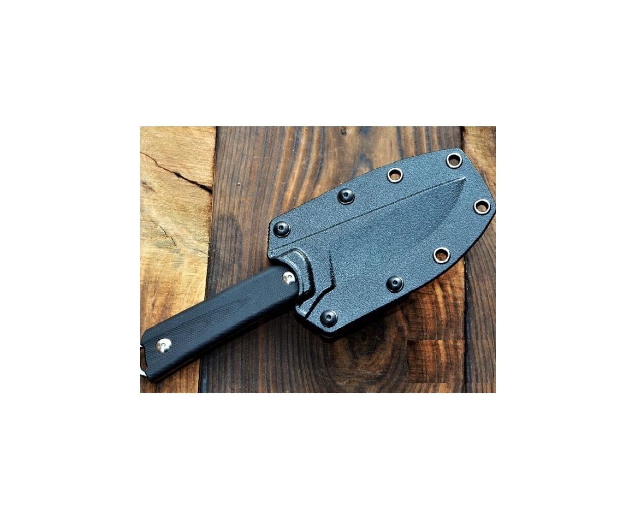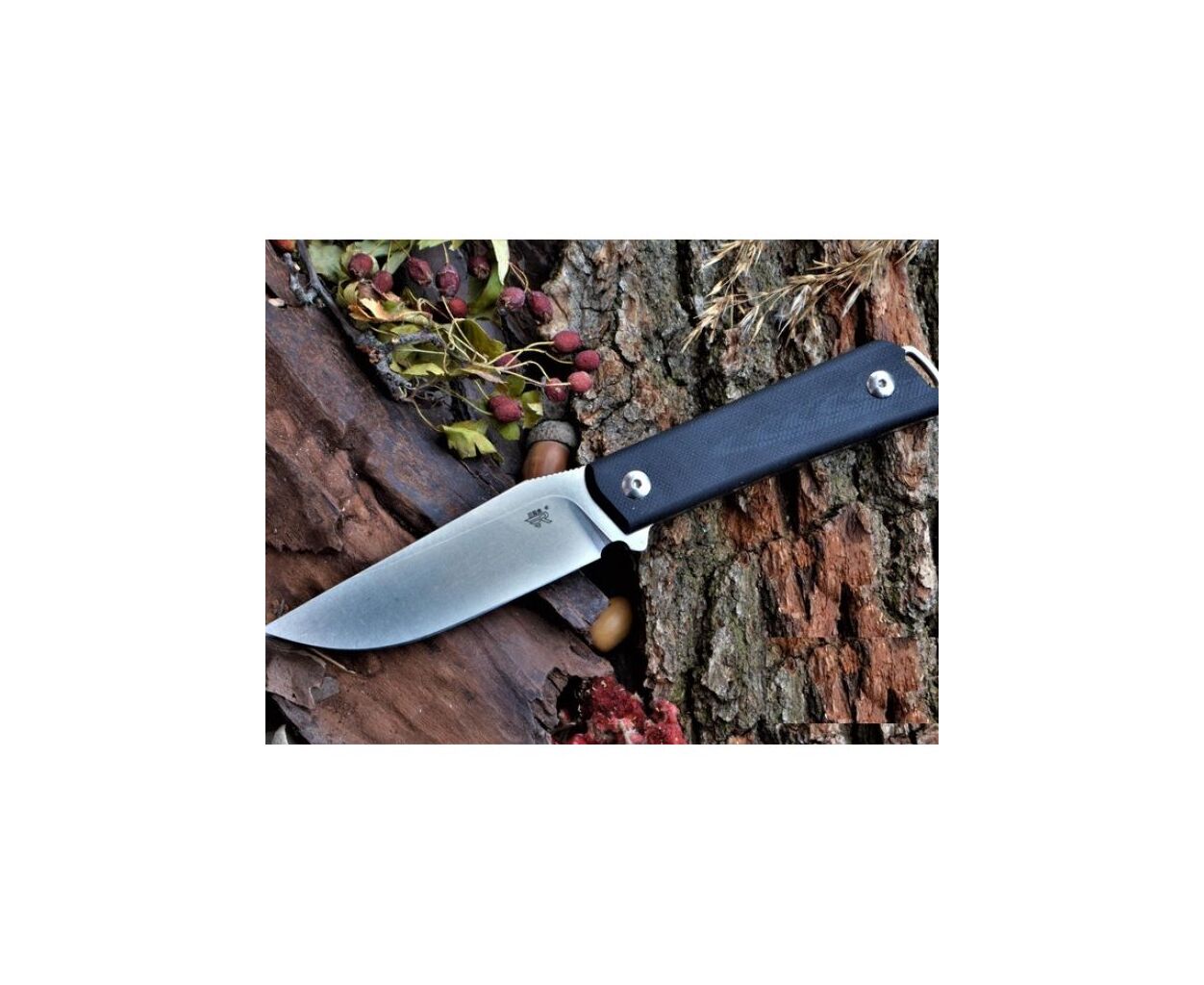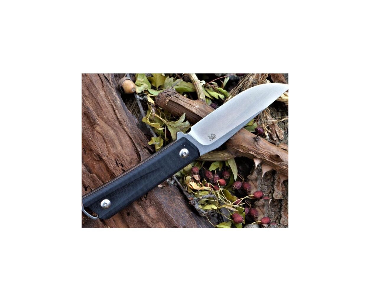 Сама рукоять конструктивно является фултангом. Накладки сделаны из G10 и крепко притянуты к хвостовику торксами. В навершии расположено кольцо для крепления темляка.
