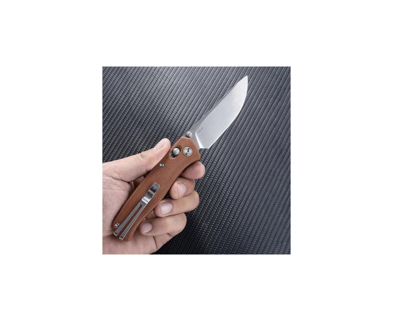 Рукоять выполнена из высокопрочной шероховатой микарты, которая обеспечивает превосходное сцепление и комфорт даже в сложных условиях эксплуатации. Эргономичный дизайн позволяет уверенно держать нож в руках, минимизируя усталость и повышая контроль при работе с инструментом, что особенно важно при активном использовании.