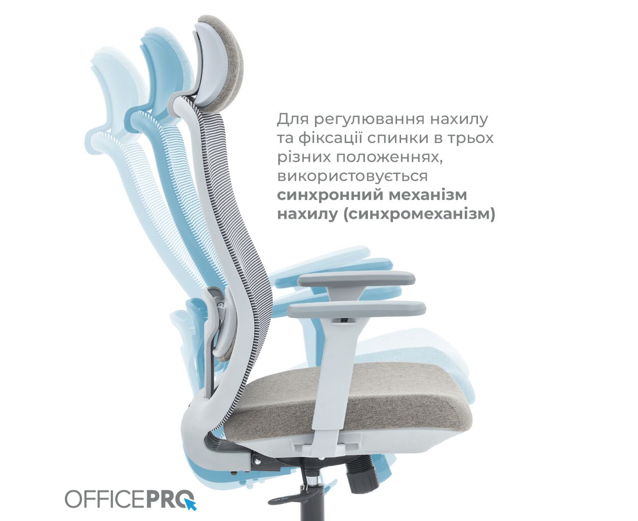 Кресло имеет нейлоновые 3D-подлокотники, оббитые мягким полиуретаном, которые регулируются по высоте, вперёд-назад, а также по горизонтали. Синхронный механизм наклона (синхромеханизм) позволяет фиксировать спинку в трёх положениях, а функция регулировки высоты сиденья и качания обеспечивает дополнительные возможности персонализации во время работы.