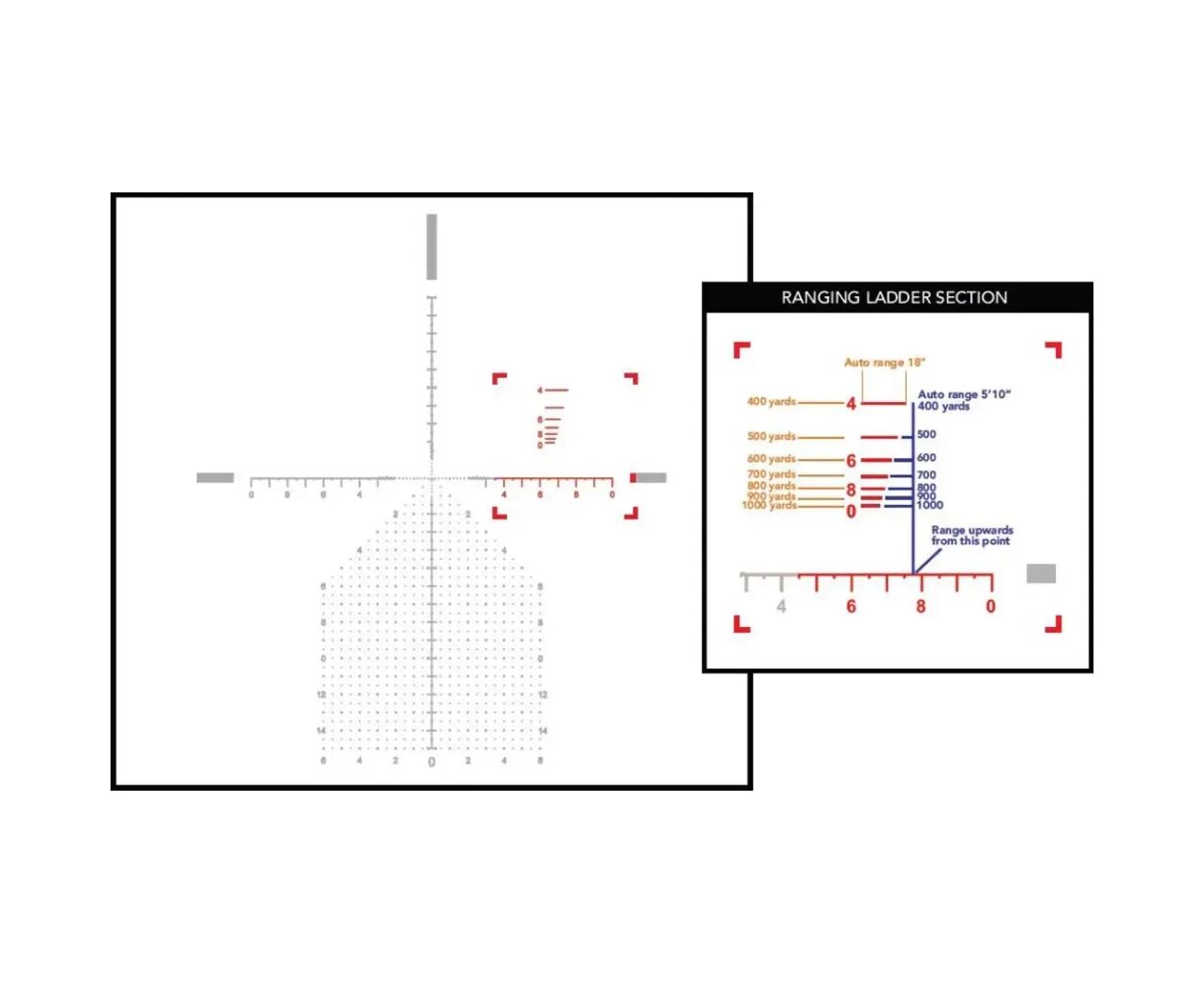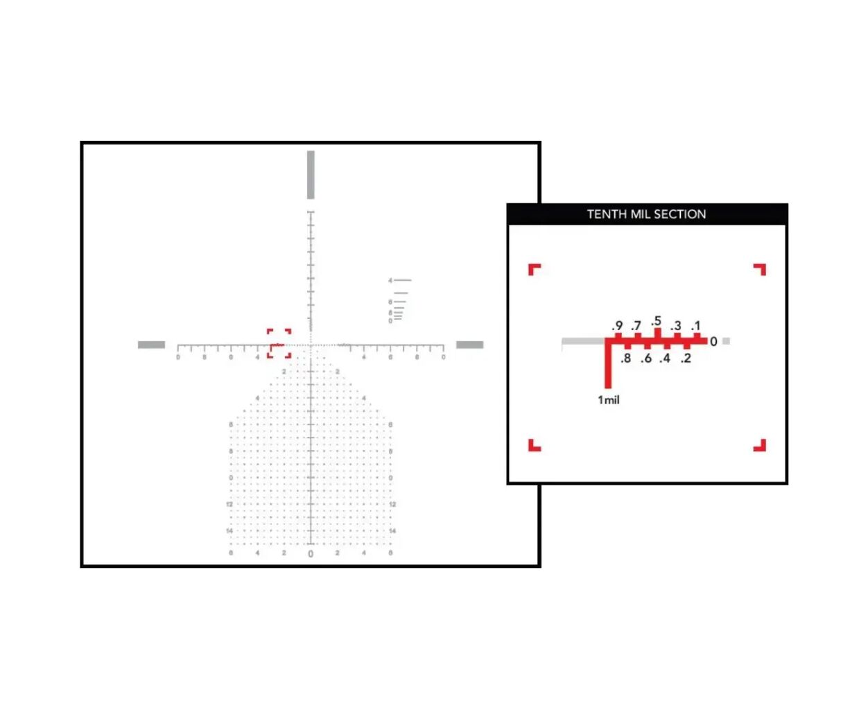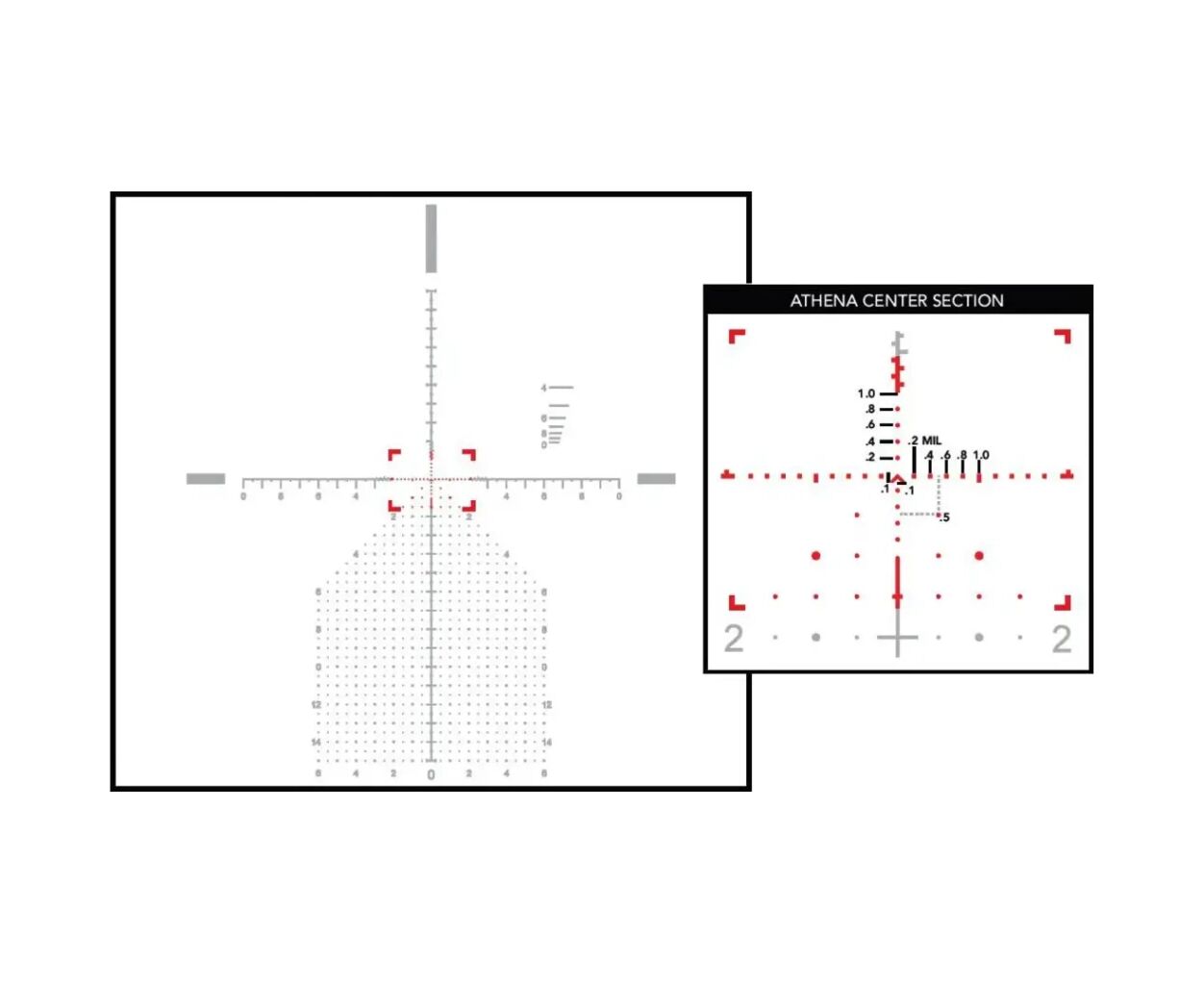 Расположение сетки ACSS Athena в FFP (первая фокальная плоскость) и широкий диапазон масштабирования превосходно подходят для винтовок с крупным калибром 50 BMG на средних и дальних дистанциях. С помощью прицельной марки можно осуществлять меткие выстрелы на дистанцию больше 900 метров. Шкала перекрестия имеет разметку в 0,2 мм для определения дальности объекта. Центральная точка в виде шевронного наконечника не создает помех. Прицельная сетка состоит из толстых меток с шагом 1 mil и тонких через каждые 0,5 mil для большого выбора ориентиров при стрельбе из любого калибра.