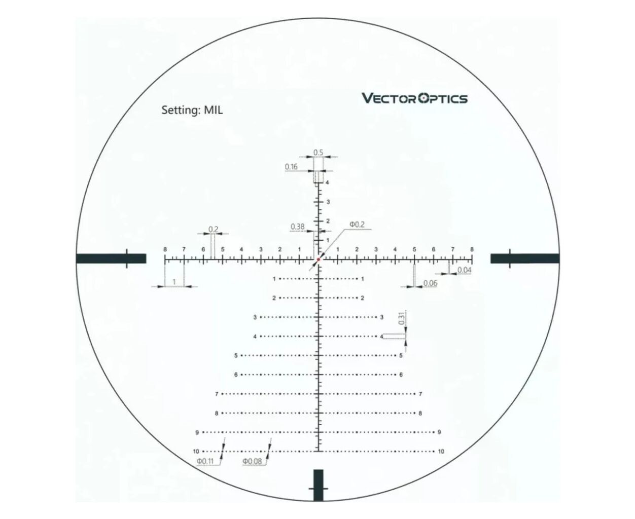 В центре внимания — травленая прицельная сетка VCT-34FFP, расположенная в первой фокальной плоскости (FFP), что обеспечивает точное масштабирование сетки при изменении кратности. Центральная точка сетки подсвечивается красным цветом, и стрелку доступны 6 уровней яркости, адаптируемых под освещение. Сетка дополнена цифровыми линиями и точками, что делает ее особенно удобной для тактической стрельбы и оценки расстояний. Прицел питается от батареи CR2032, обеспечивающей работу подсветки прицельной сетки.