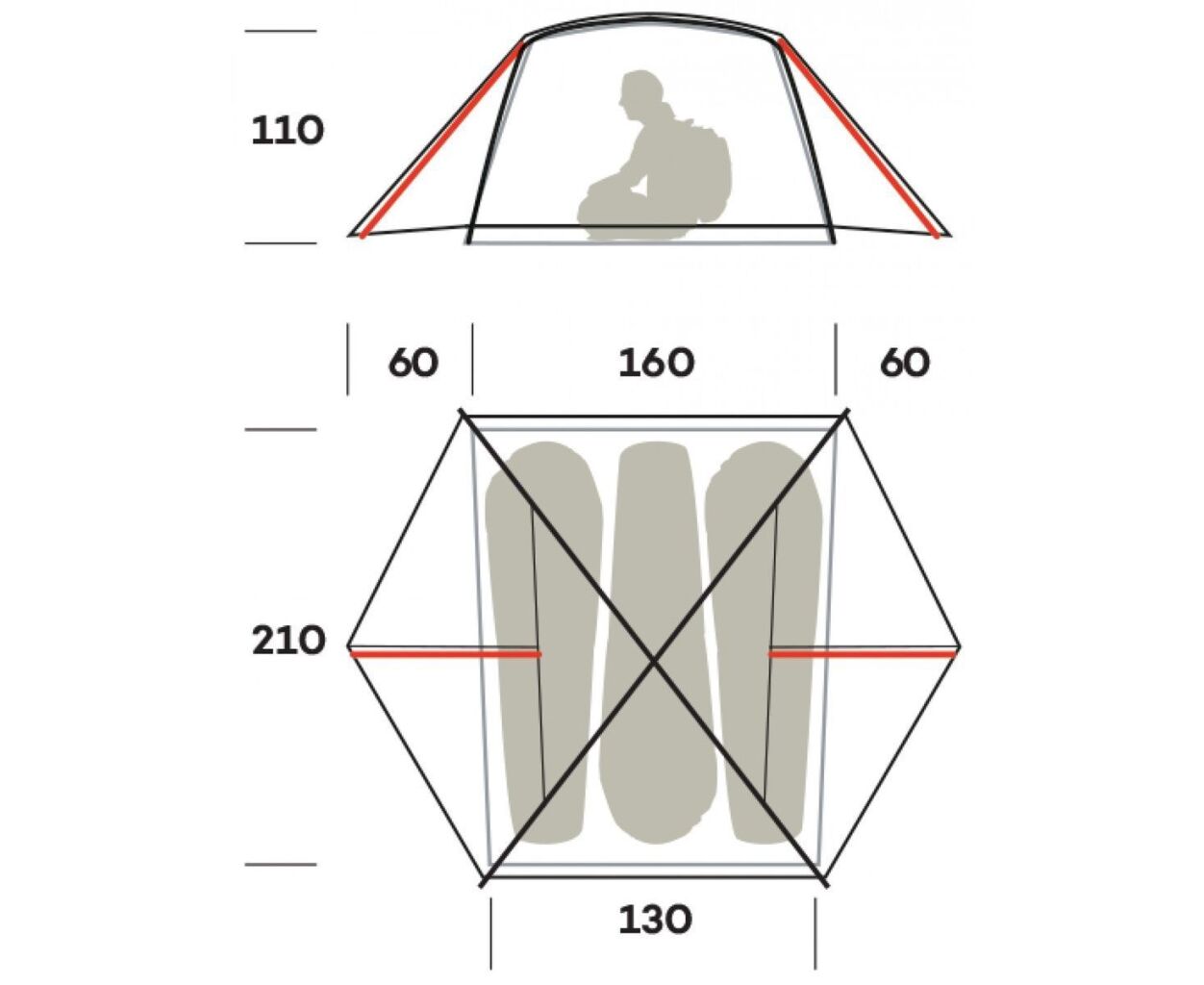 - Основные преимущества палатки — минимальная площадь, вес конструкции и время установки. Предварительно изогнутые дуги и распорка позволяют достичь достаточного внутреннего объема и придают прочности конструкции.