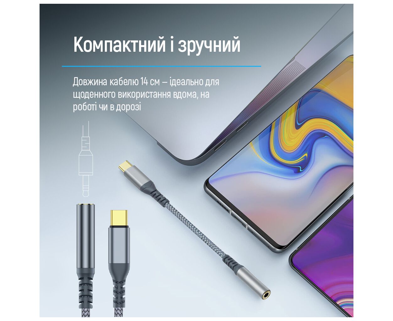 - Легко использовать: достаточно подключить кабель 3.5 мм к адаптеру, а адаптер — к порту Type-C.