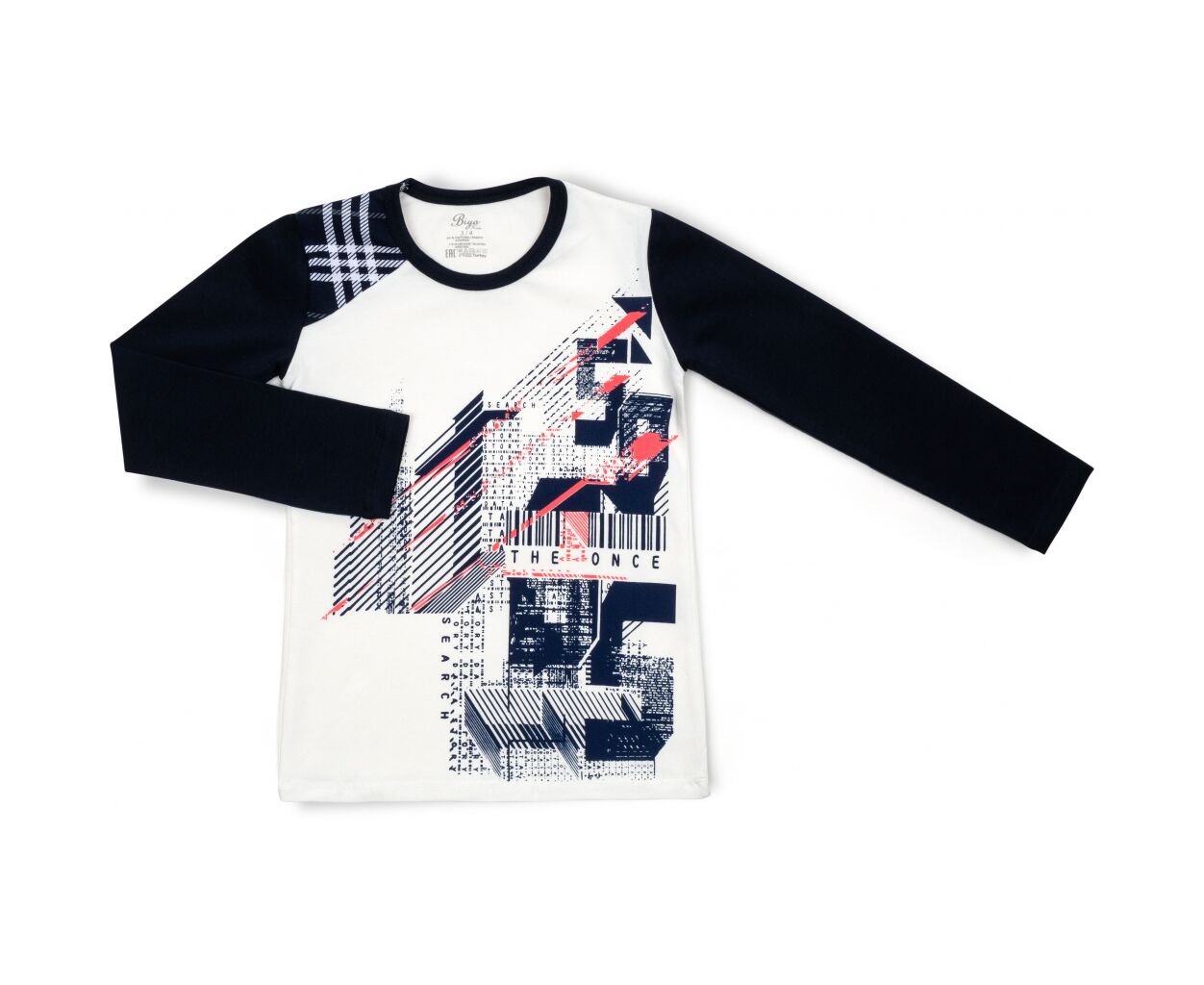 Уютный джемпер прямого силуэта, скомбинирован из кремового и тёмно - синего цветов (рукава), с овальной горловиной и длинным вшивным рукавом, украшен спереди графическим объёмным принтом. Рукав прямой, без манжета. Горловина обработана мягкой трикотажной обтачкой.