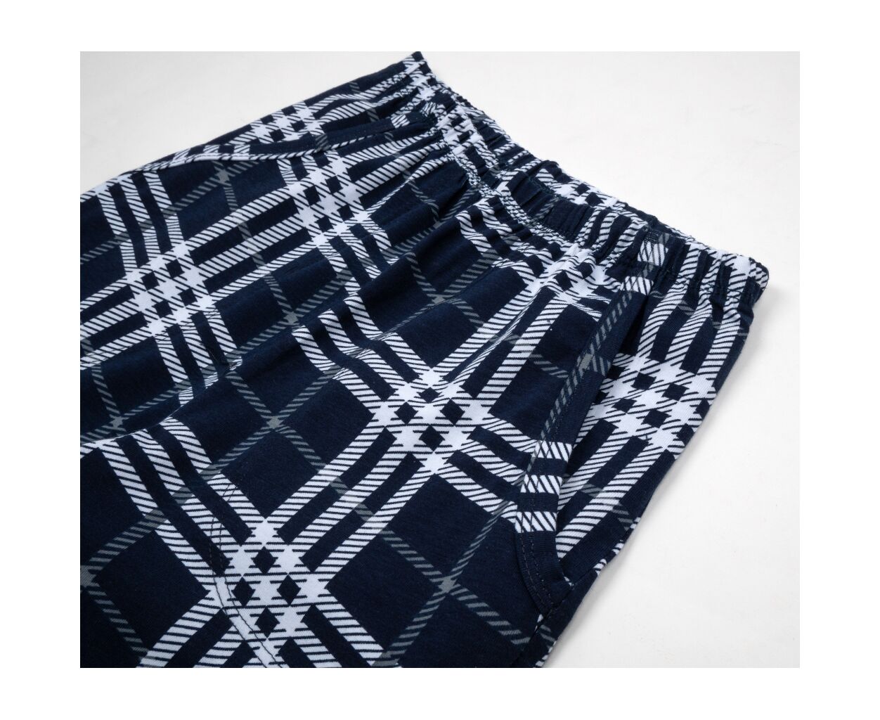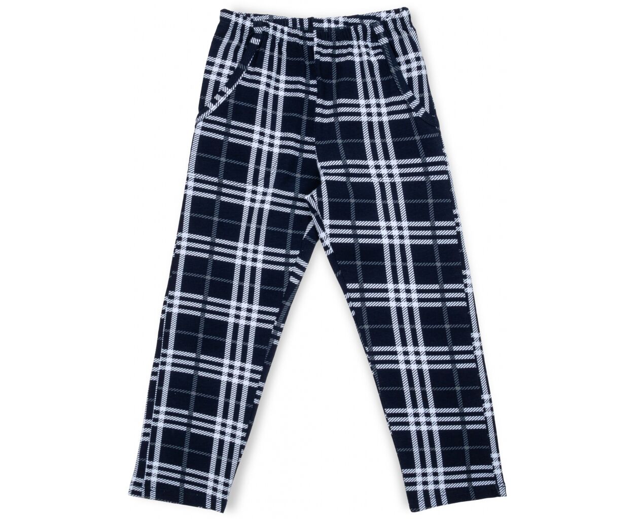 Штаны тёмно - синего цвета в крупную клеточку. Крой свободный, прямой, в поясе под резиночку. Посадка высокая. Имеется два кармана.