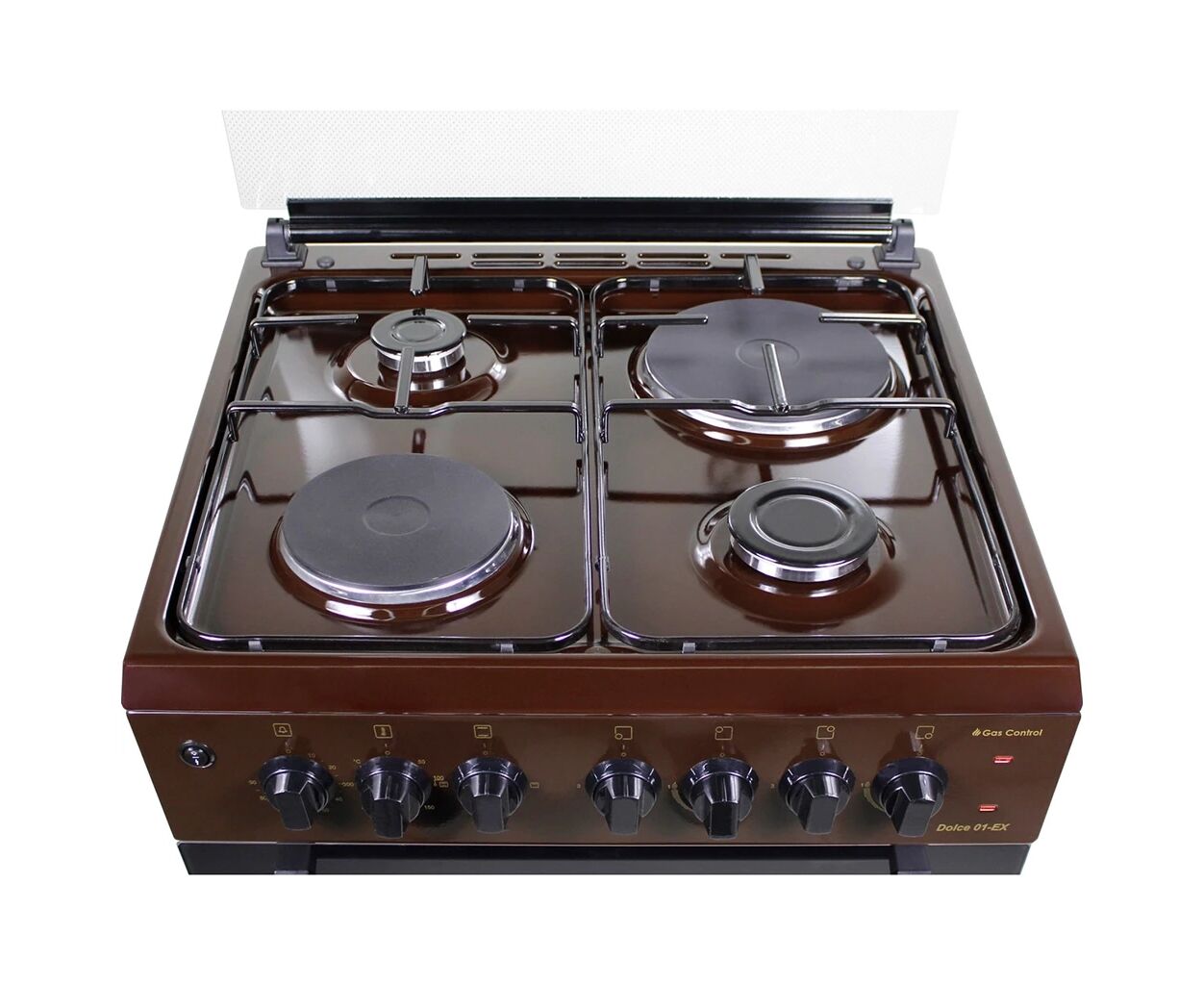 Тип - комбинированная (газ+электро), количество конфорок - 2 газовые + 2 электрические, тип духовки - электрическая, Гриль - есть, электрический, Конвекция - есть, рельефные, гриль, конвекция, традиционный нагрев, есть, есть, 85 см, 60 см, 60 см, 42 кг, коричневый
