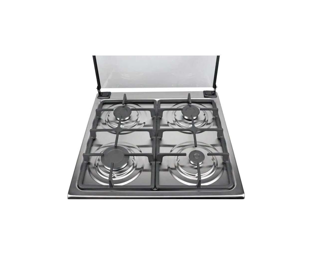 Варочная поверхность оснащена четырьмя газовыми конфорками, подходящими для приготовления различных блюд одновременно. Чугунные решетки обеспечивают стойкость посуды и долговечность в использовании. Для дополнительного удобства плита имеет стеклянную крышку, защищающую рабочую поверхность, когда она не используется. Важным преимуществом является система газ-контроля как для конфорок, так и для духовки, что гарантирует безопасность при эксплуатации.