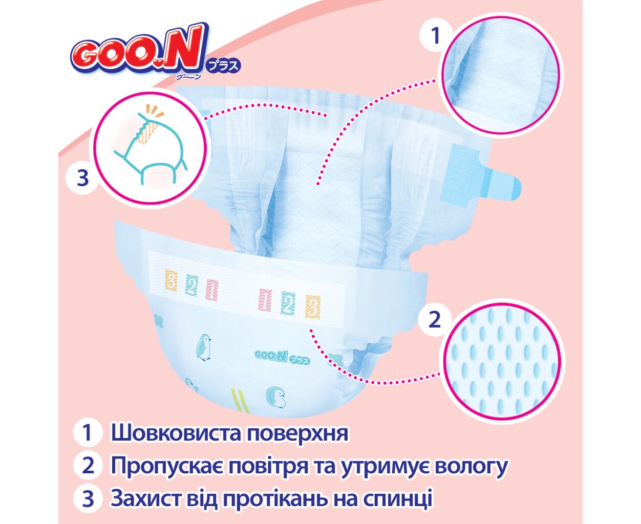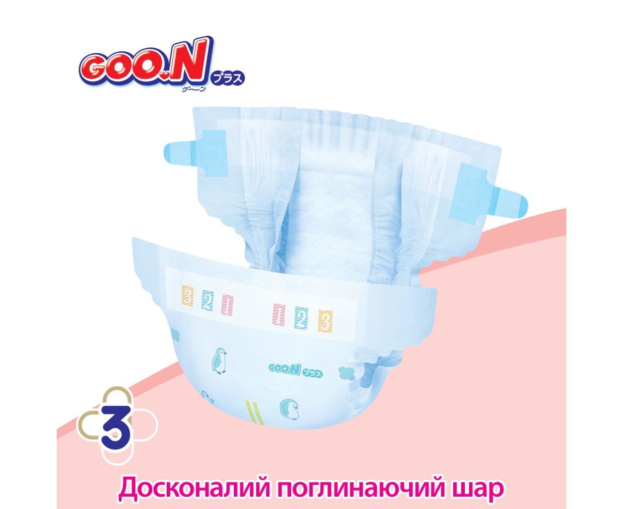 Уникальные ультратонкие и пушистые волокна подгузников, обогащенные увлажняющим лосьоном, обеспечивают чрезвычайно гладкую текстуру для комфортного контакта с кожей малыша. Благодаря этому, подгузники GOO.N Plus на 40% более шелковистые и вдвое более гладкие, чем обычные.