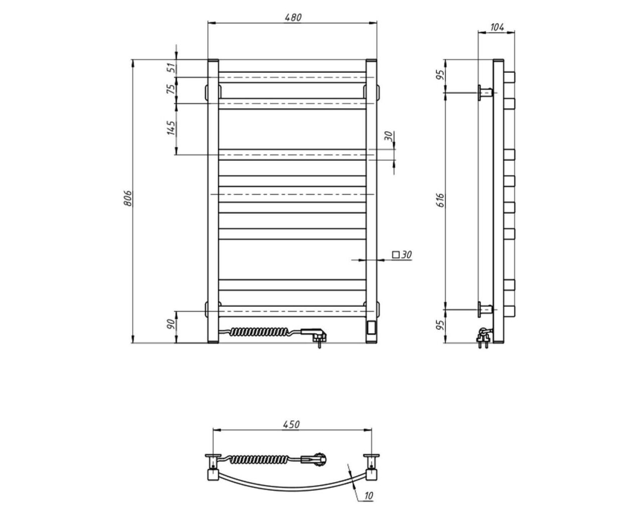 электрический, лесенка, слева, 1/2", сухой тэн, 145 Вт, 55 °C, IP44, крашеная сталь, 800 мм, 480 мм, 104 мм