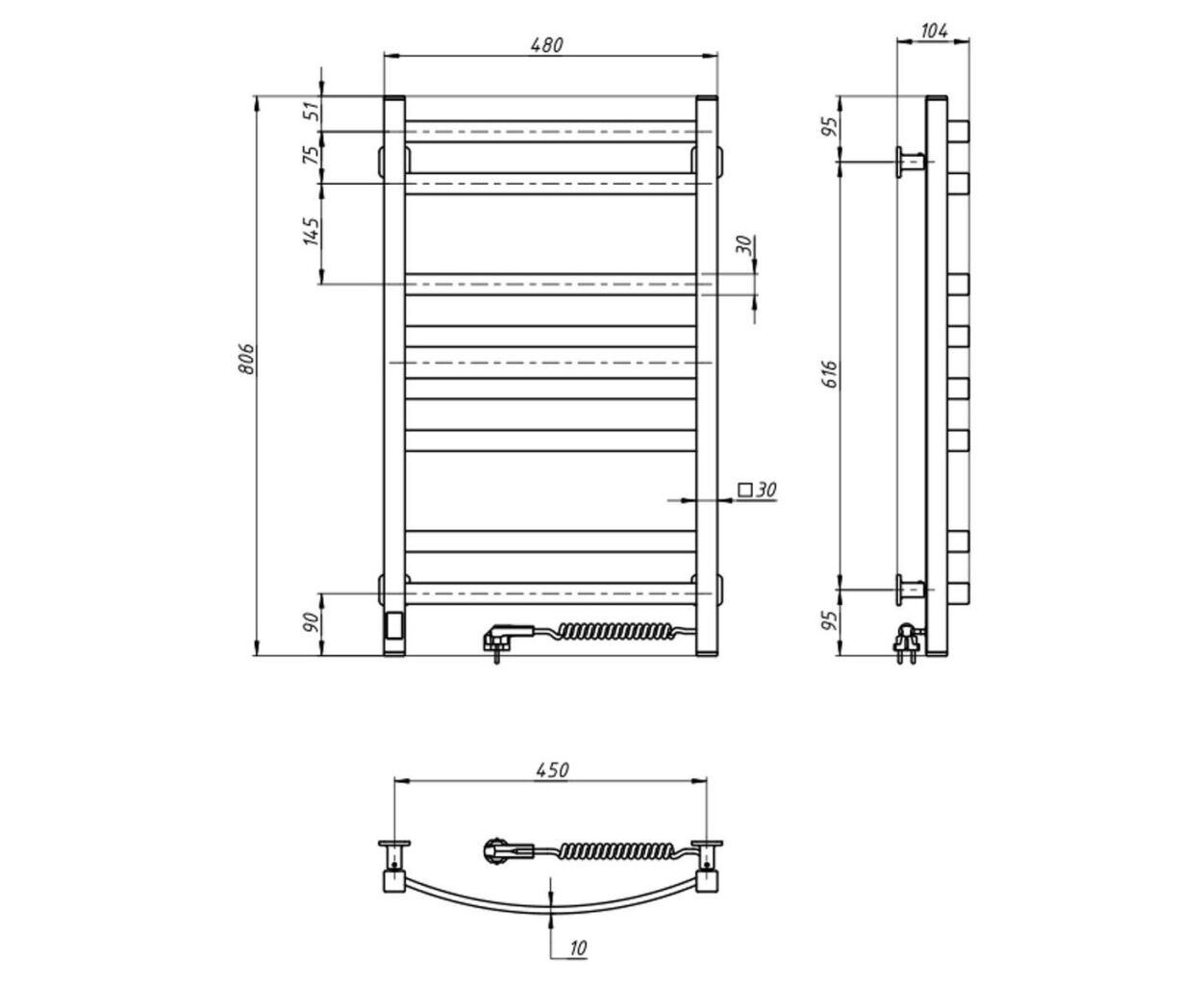 электрический, лесенка, справа, 1/2", сухой тэн, 145 Вт, 55 °C, IP44, крашеная сталь, 800 мм, 480 мм, 104 мм