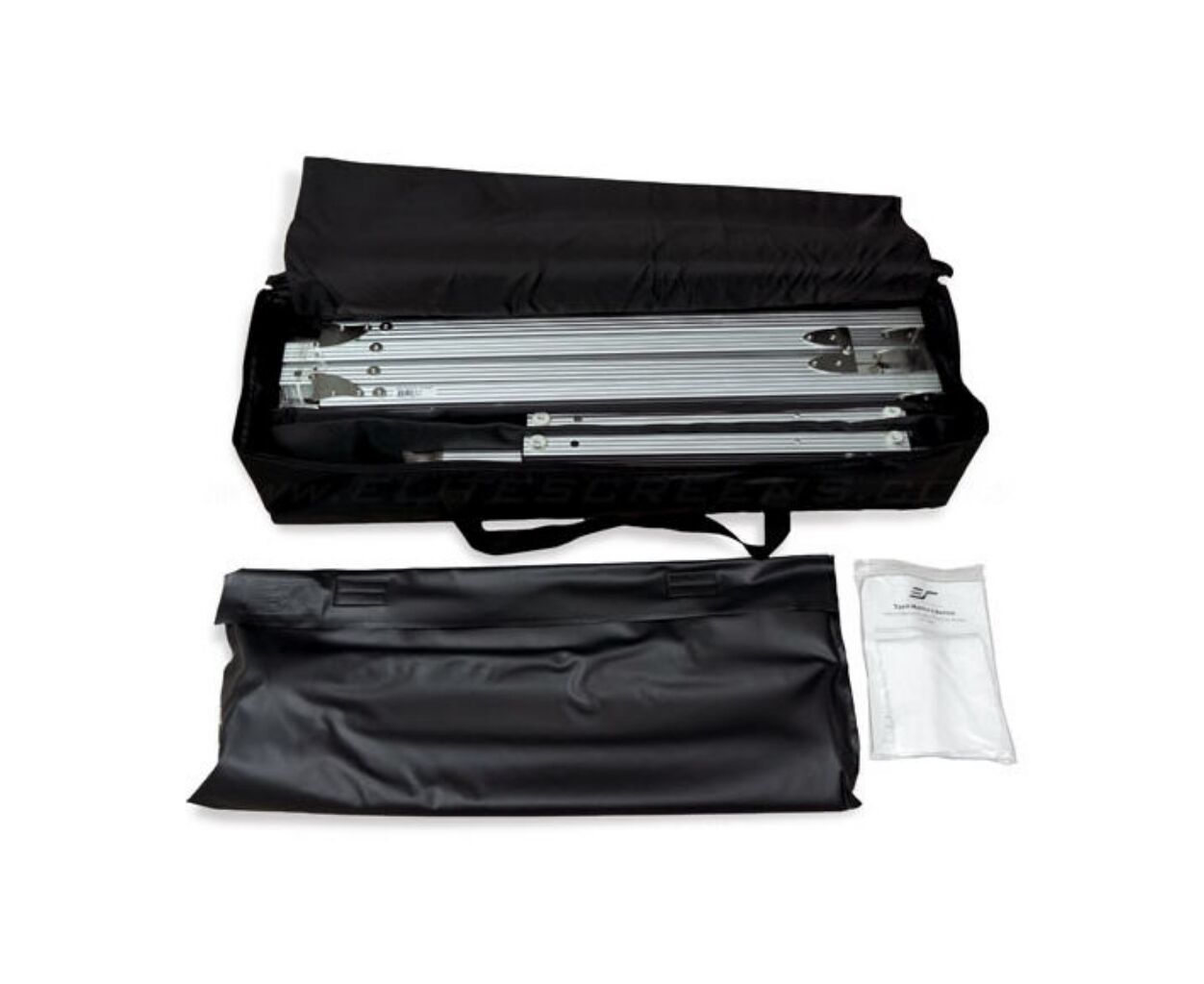 Алюминиевая рама состоит из труб квадратного сечения, что обеспечивает легкость и прочность. Рама раскладывается за считанные минуты, затем на заклепки крепится полотно и присоединяются Т-образные ножки.