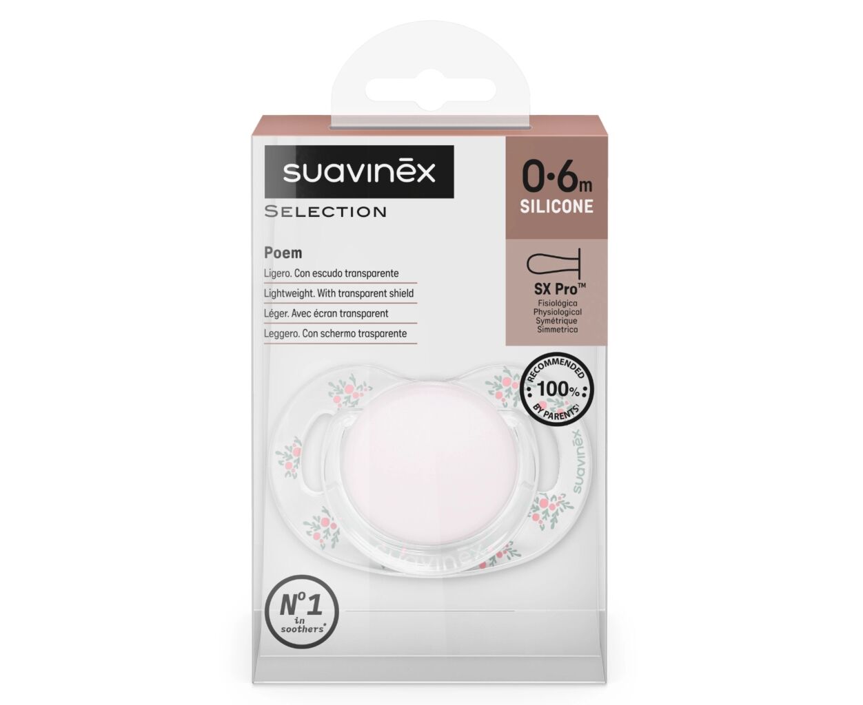 Описание Пустышка Suavinex Poetry фізіологічна, 0-6 місяців, світло-рожева з малюнком (308929)