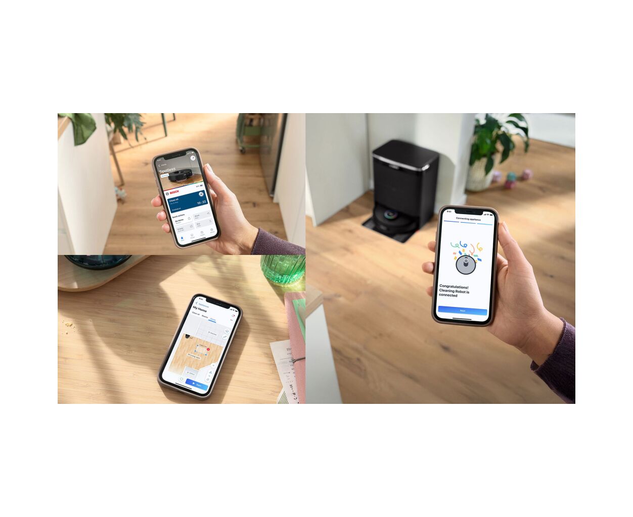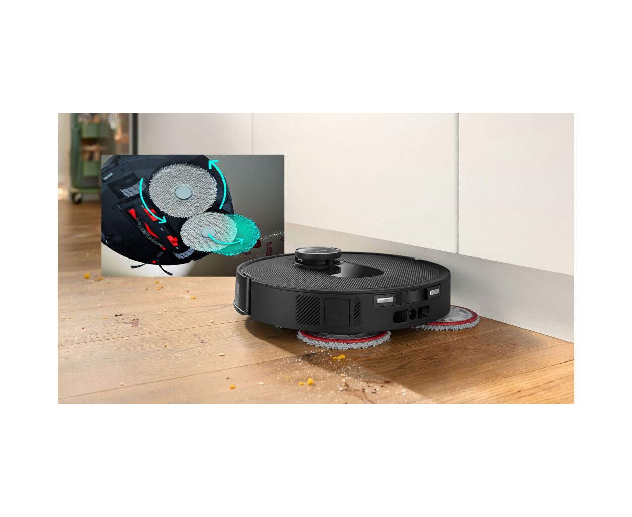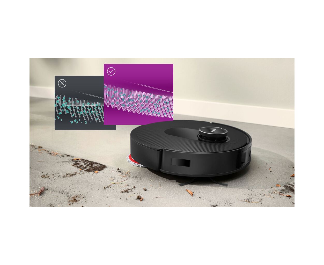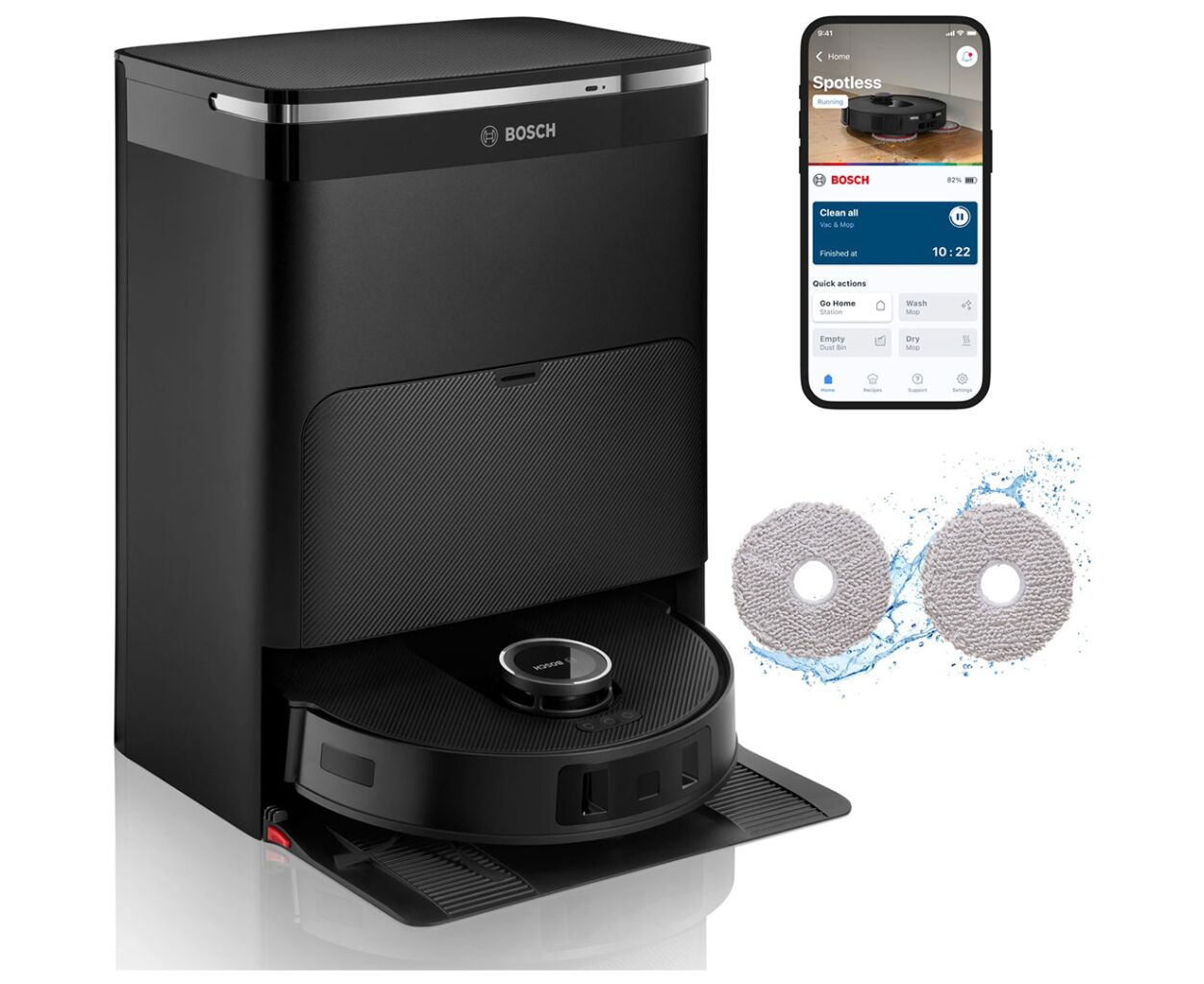 Функции гигиены включают уменьшение запутывания волос, одновременно пылесосение и мытье полов, а класс фильтрации F9 задерживает мелкую пыль размером 1–10 мкм. Станция сухой и влажной уборки автоматически заряжает работа, опорожняет пылесборник во встроенный 3-литровый контейнер, моет и сушит мопы водой до 70°C горячим воздухом и обнаруживает чрезвычайно загрязненные мопы.