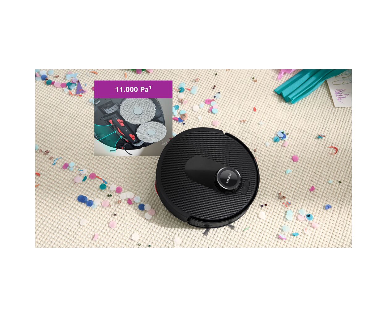 Робот-пылесос Bosch BCRDW3B сочетает в себе высокую производительность, современные технологии и максимальный комфорт при уборке. Благодаря щетке Carbon Power с плотно упакованными щетинками он обеспечивает тщательную очистку всех типов поверхностей. Мощность всасывания до 11 000 Па гарантирует надежное удаление пыли и грязи. Карты с расширенным радиусом действия эффективно очищают стены и углы, удаляя грязь толщиной до 2 мм из стен и до 30 мм в углах.
