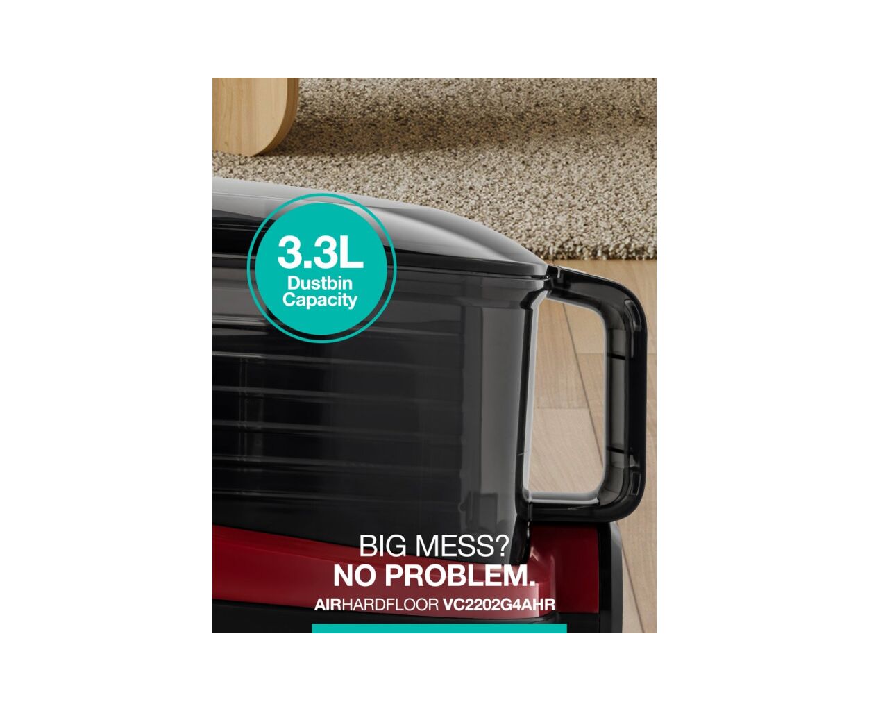 Пылесос AIRHARDFLOOR оснащен пластиковым контейнером объемом 3,3 л и мощностью всасывания 330 Вт. Он имеет телескопическую металлическую трубку и гибкий шланг для удобной уборки. Сенсорное управление и поворотная ручка обеспечивают комфортное использование. Благодаря длинному кабелю, защитному бамперу и резиновым колесам прибор легко маневрирует и безопасен в эксплуатации.