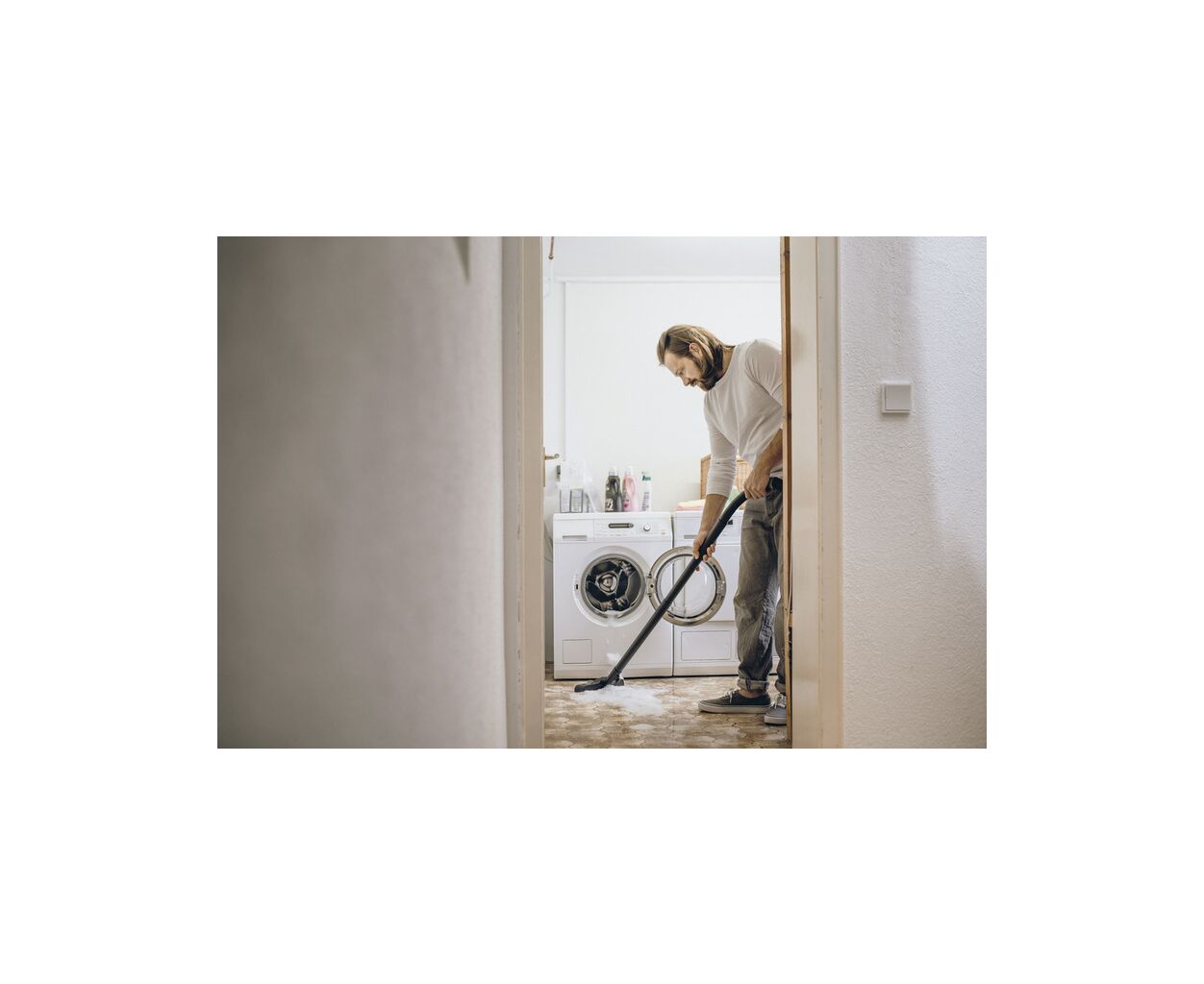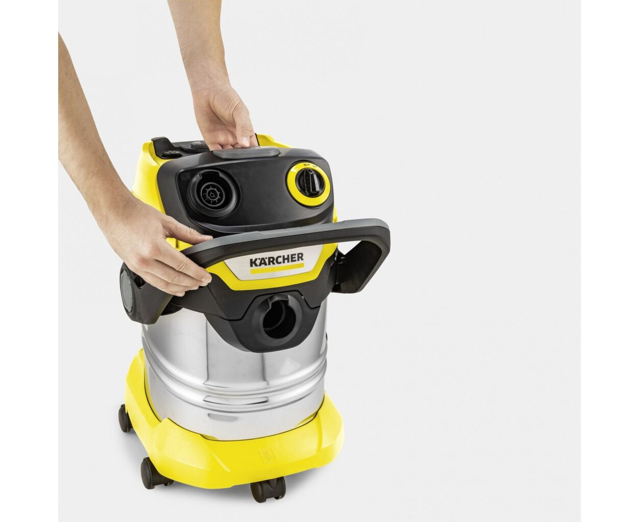 Хозяйственный пылесос WD 5 S V-25/5/22 оптимально сочетается с входящими в комплект его поставки всасывающим шлангом и переключаемой насадкой для пола, благодаря чему при невысокой потребляемой мощности (1100 Вт) гарантируются превосходные результаты сбора мусора всех видов – сухого или влажного, крупного или мелкого. Аппарат оснащен прочным 25-литровым мусоросборником из нержавеющей стали, 5-метровым кабелем, всасывающим шлангом длиной 2,2 м со съемной антистатической рукояткой, переключаемой насадкой для пола, плоским складчатым фильтром и фильтр-мешком из нетканого материала. Плоский складчатый фильтр позволяет чередовать операции влажной и сухой уборки без затрат времени на замену фильтра, а запатентованная система его быстрого извлечения исключает контакт с грязью. Система очистки фильтра, активируемая нажатием кнопки, обеспечивает быстрое восстановление полной силы всасывания. Благодаря съемной конструкции рукоятки насадки могут присоединяться непосредственно к всасывающему шлангу, который может компактно и надежно храниться в верхней части аппарата. Для быстрого и удобного закрепления удлинительных трубок и насадки для пола предусмотрены держатели, сформованные в отбойнике пылесоса.