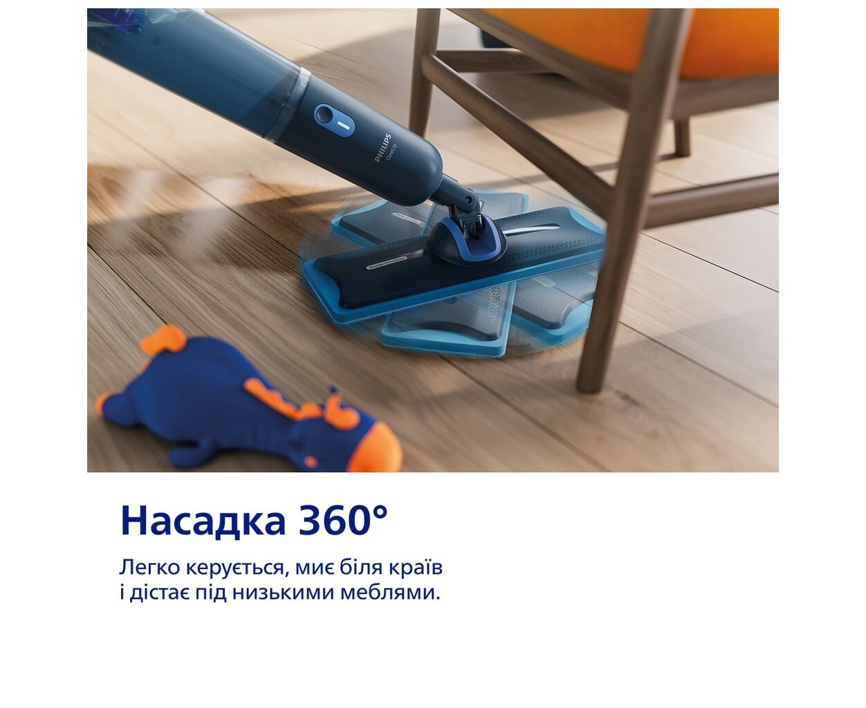 Благодаря шарниру с вращением на 360° швабра легко достается под мебель и углы, а беспроводная конструкция обеспечивает полную свободу движения без кабелей. Одного заряда аккумулятора хватает до 50 минут работы, чего достаточно для уборки квартир площадью до 125 м2, при этом один резервуар позволяет очистить до 50 м поверхности.