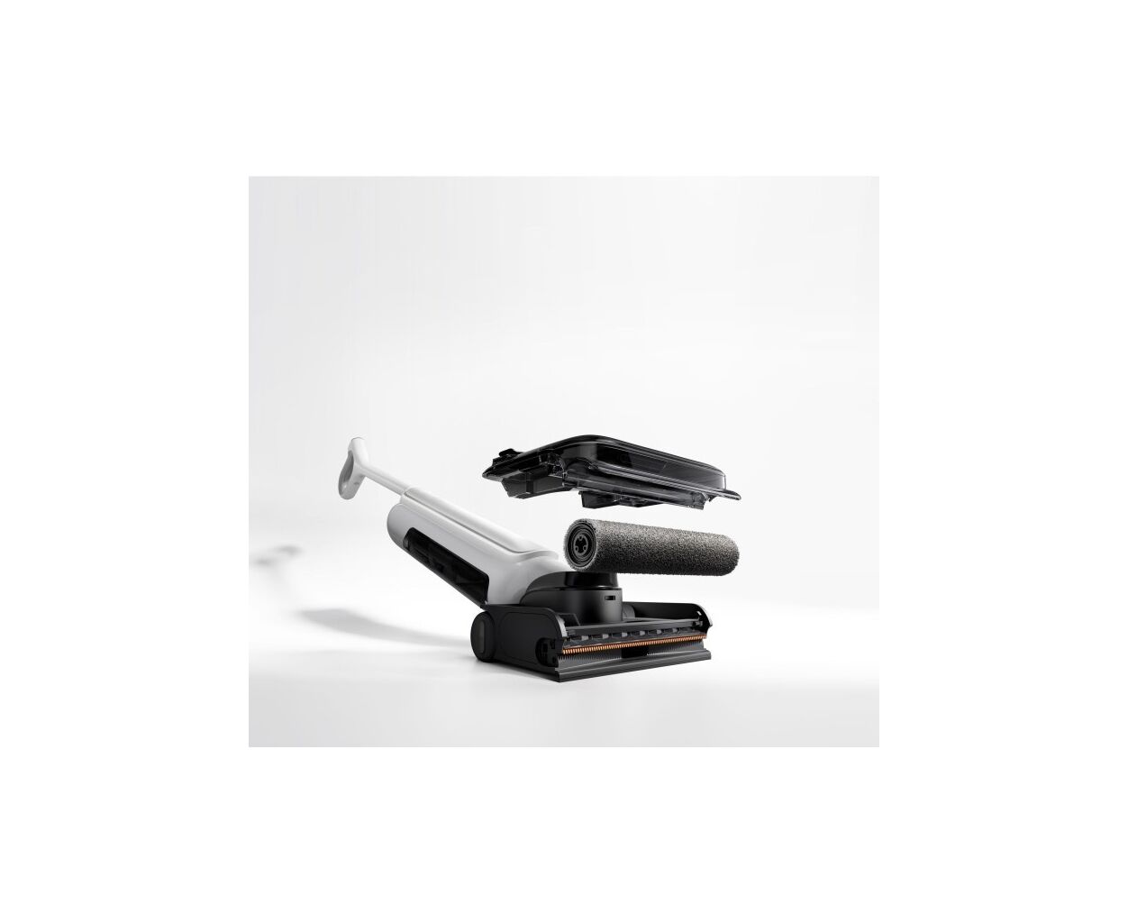 Специально разработанный комплекс из пяти функций предназначен для борьбы с влагой и следами на полу. Встроенный насос с постоянным давлением точно регулирует подачу воды, предотвращая её избыток. Волоконная щётка высокой плотности с увеличенной на 12% эффективностью поглощения удерживает больше влаги. Сбор грязной воды ускорен на 322%, благодаря чему пол практически сразу становится сухим. Скребок из TPE удаляет влагу во время уборки, а металлический элемент с постоянным давлением дополнительно очищает роликовую щётку от грязи и остатков воды. Широкий всасывающий порт снижает количество водяных пятен на 62%, обеспечивая мощный сбор жидкости. В результате - твои полы сияют чистотой без разводов уже за один проход.