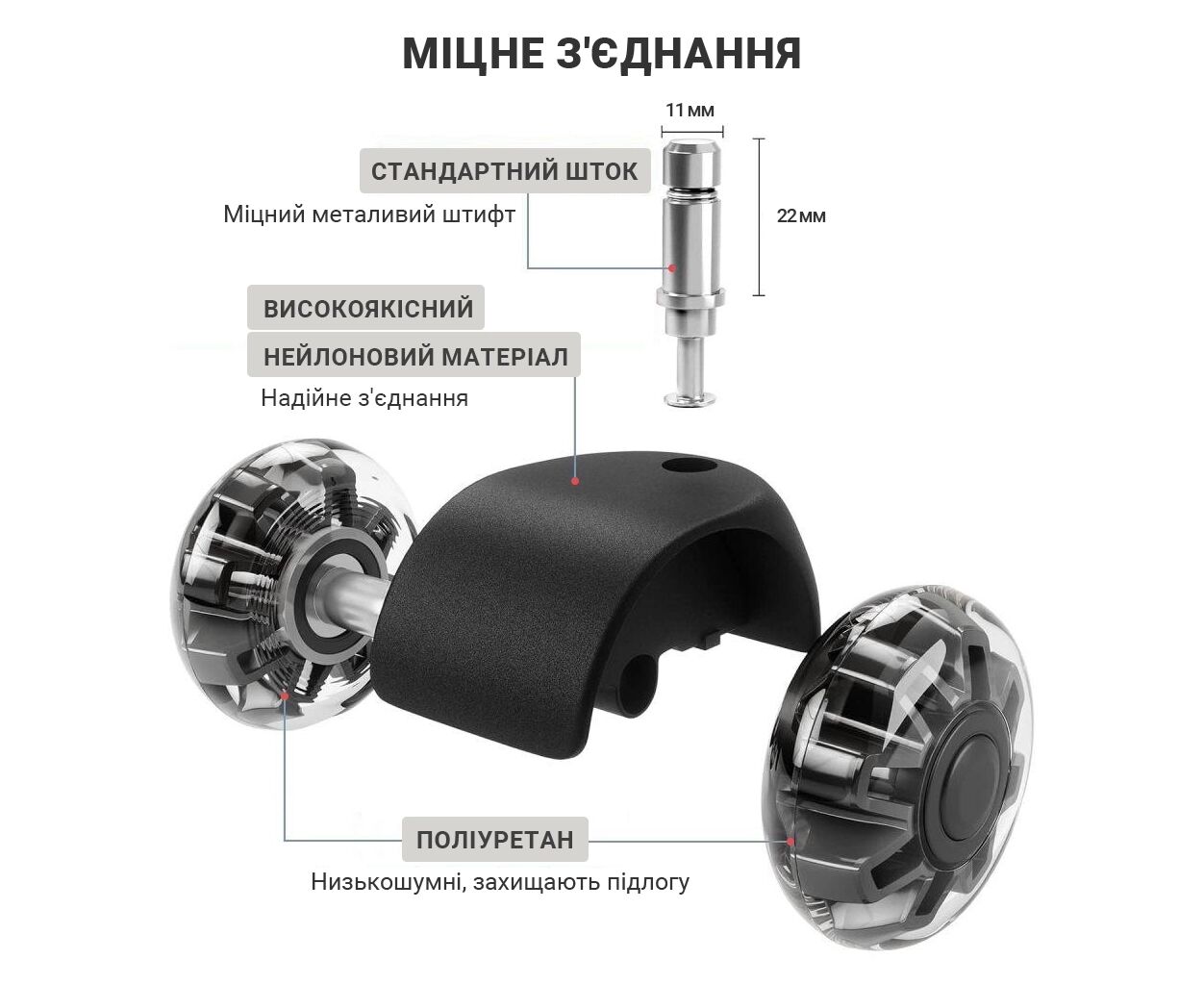 Количество, шт - 1, пластик, полиуретан, Диаметр колеса, мм - 50, Диаметр стержня, мм - 11