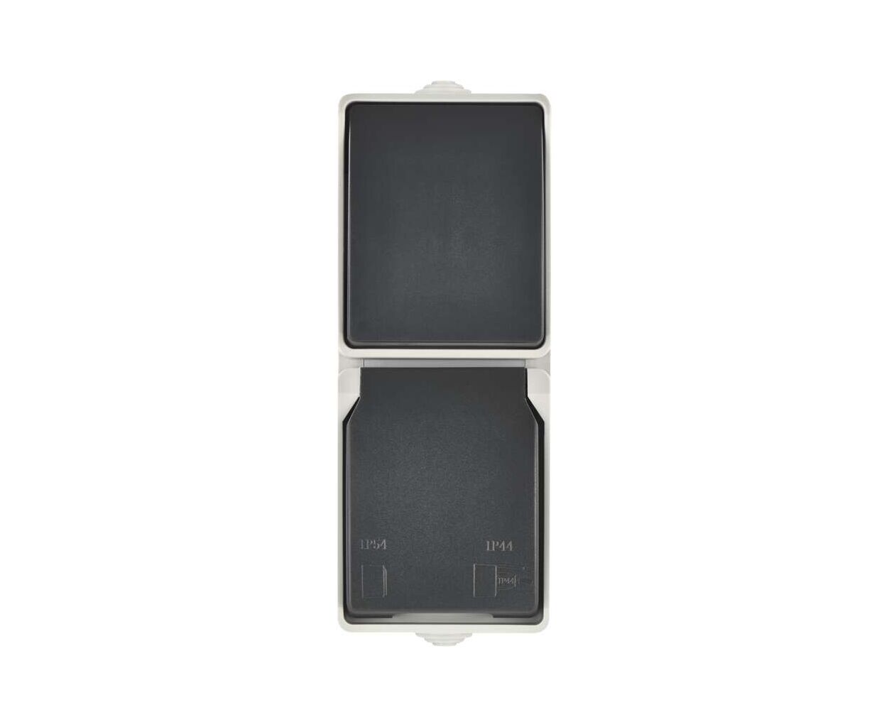 Описание Розетка EMOS + вимикач прохідний вертикальний зовнішній сірий IP44 (A1396.4)