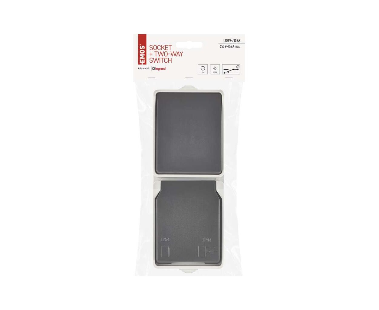 Характеристики Розетка EMOS + вимикач прохідний вертикальний зовнішній сірий IP44 (A1396.4)