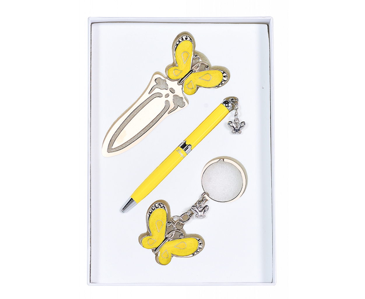 Langres Fly – подарочный набор, в котором сочетаются стиль и функциональность.В составе набора – ручка, брелок и закладка для книг. Ручка привлекает внимание яркой расцветкой и сиянием глянца. Изделие декорировано кристаллами и подвеской в виде бабочки.Для ручки подходит стержень D1 LS.499002.Брелок с прочным кольцом для ключей выполнен в форме бабочки, что несомненно придется по вкусу романтичным девушкам. Закладка для книг изготовлена из тонкого легкого металла, обеспечивая дополнительно удобство при чтении. Изделие украшено фигуркой бабочки, которая будет умилять при одном только взгляде на любимую книгу.Набор упакован в подарочный футляр, перевязанный ленточками.