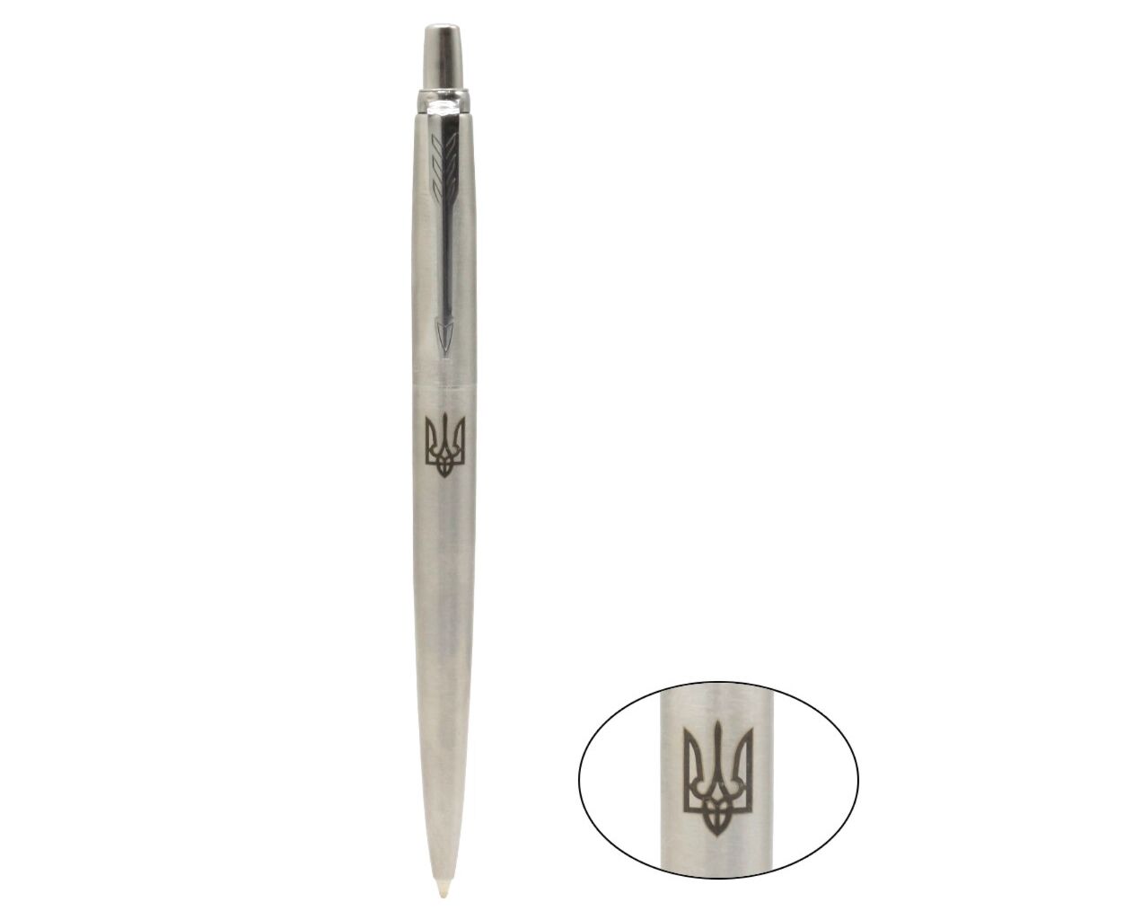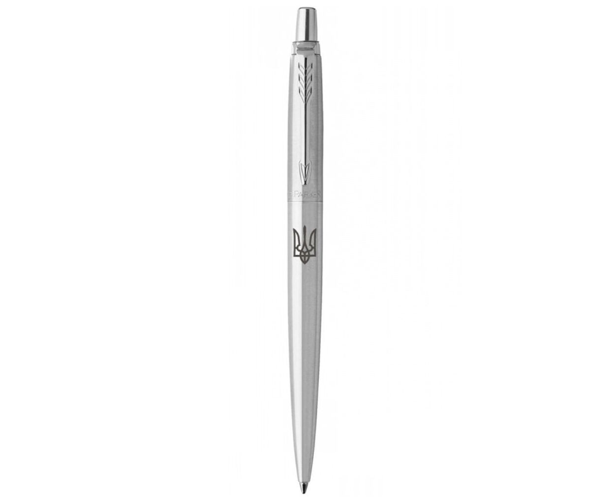 Эксклюзивный дизайн шариковой ручки JOTTER Stainless Steel CT BP с гравировкой Герба Украины (Трезубец). Изображение нанесено на оригинальную ручку из серии Jotter (Джоттер). Культовая модель Parker в цельнометаллическом дизайне. Удобство и производительность в доступной ценовой категории. Данная модель станет прекрасным подарком к государственным и национальным праздникам для истинных патриотов.