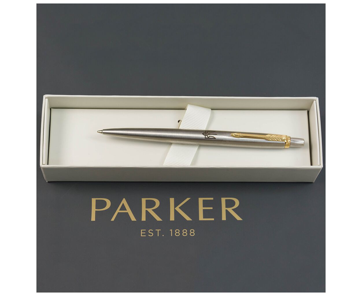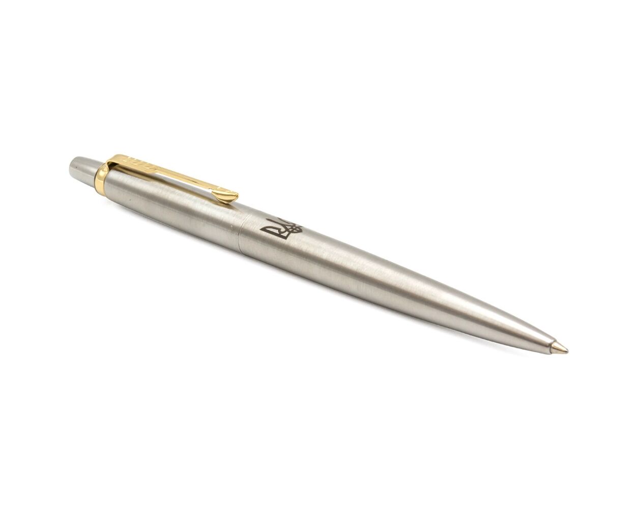 Parker JOTTER Stainless Steel GT BP_Трезубец (полированный стальной дизайн с гравировкой и позолотой) - эксклюзивная шариковая ручка из линейки культовых пишущих инструментов JOTTER (Джотер). Оригинальная ручка дополнена лазерной гравировкой Герба Украины черного цвета.
