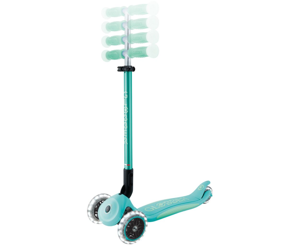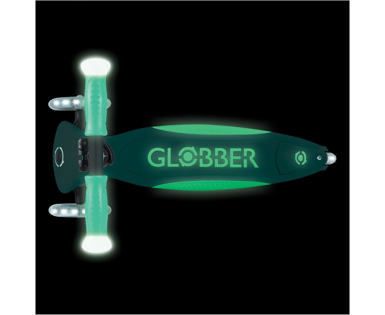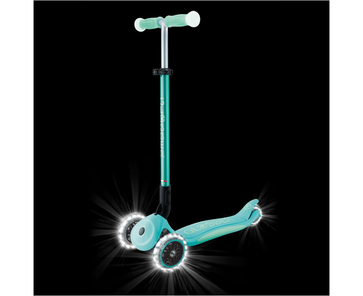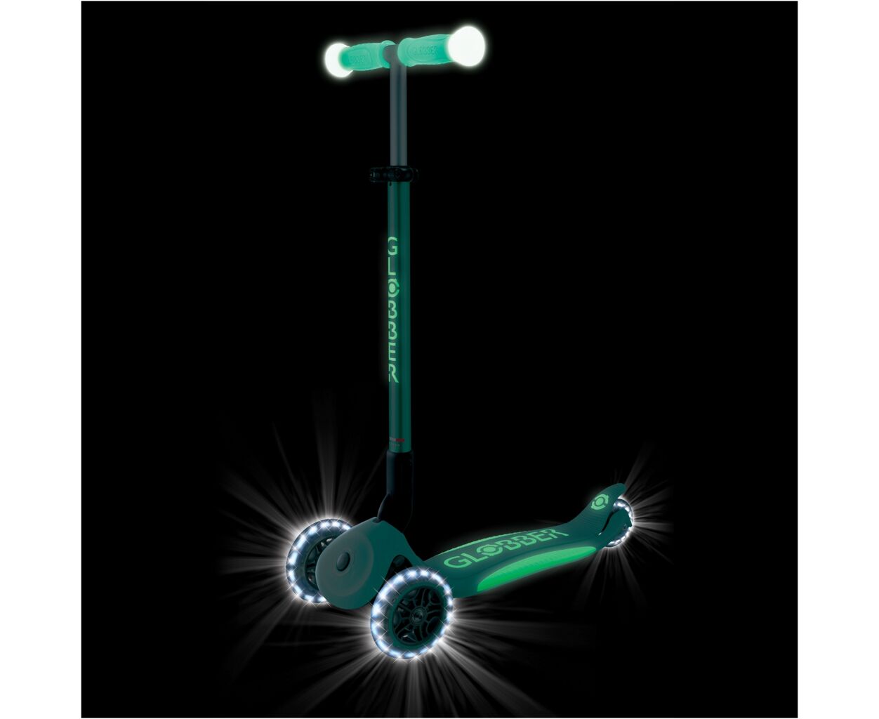 Elite Lights Glow также оснащен запатентованной системой блокировки и сборки руля Globber, прочной противоскользящей декой, Т-образным рулем с регулируемой высотой в 4-х положениях со светодиодными ручками и светодиодными колесами без батареек – как спереди, так и сзади – которые блестят!