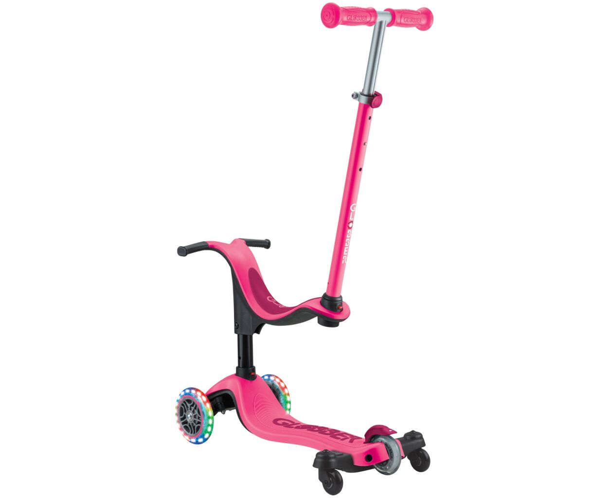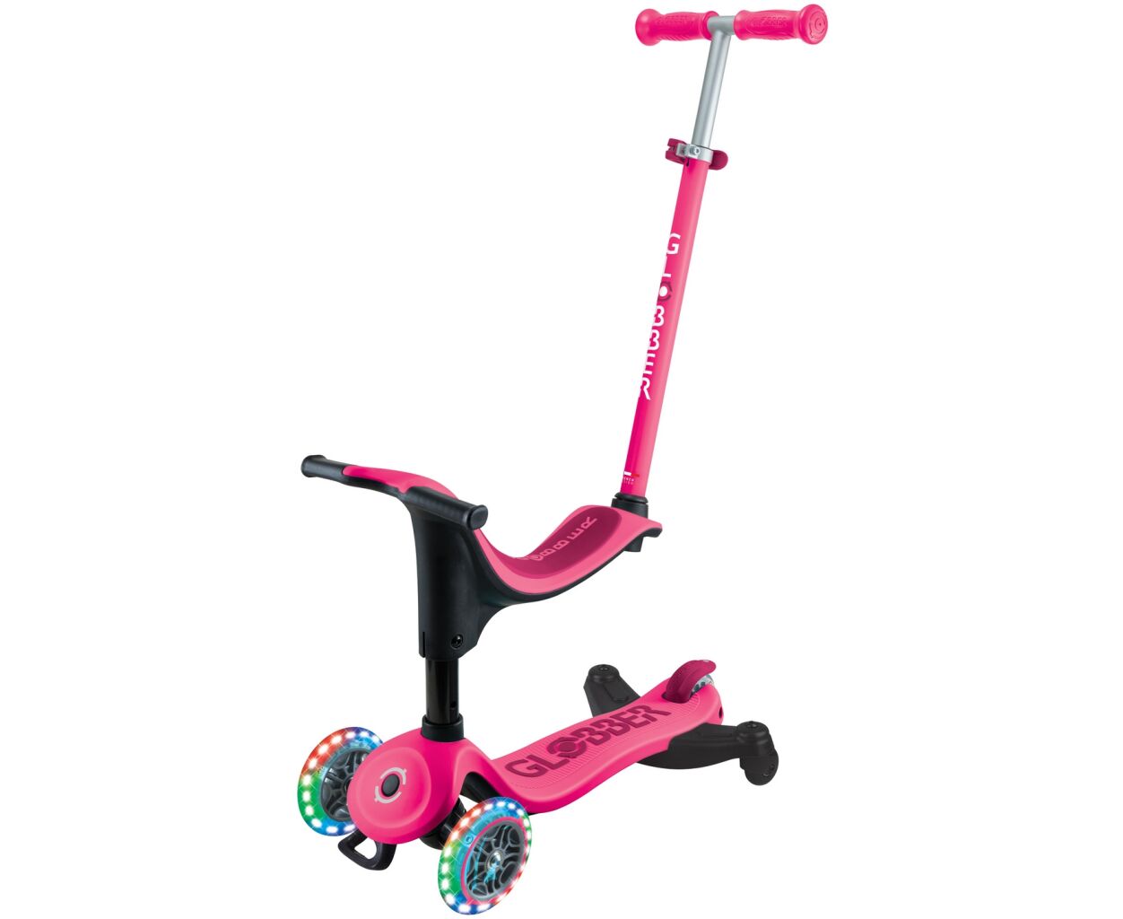 Globber Go UP Sporty Lights 360 ° - универсальный самокат-трансформер для детей от 1 года. Благодаря инновационной системе трансформации 4-в-1, он легко превращается из каталки-беговела со съемным сиденьем в классический трехколесный самокат. Яркие светодиодные колеса с подсветкой придают безопасности и делают катание веселее.