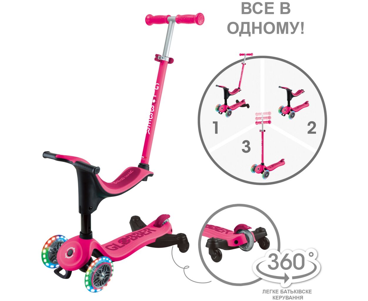 Самокат Globber Go Up Sporty 360 колеса з підсвіткою Фуксія (456-610)