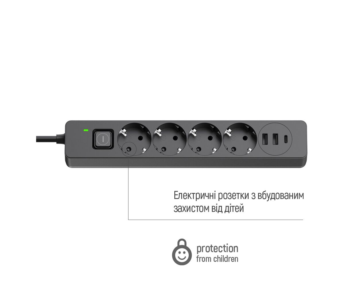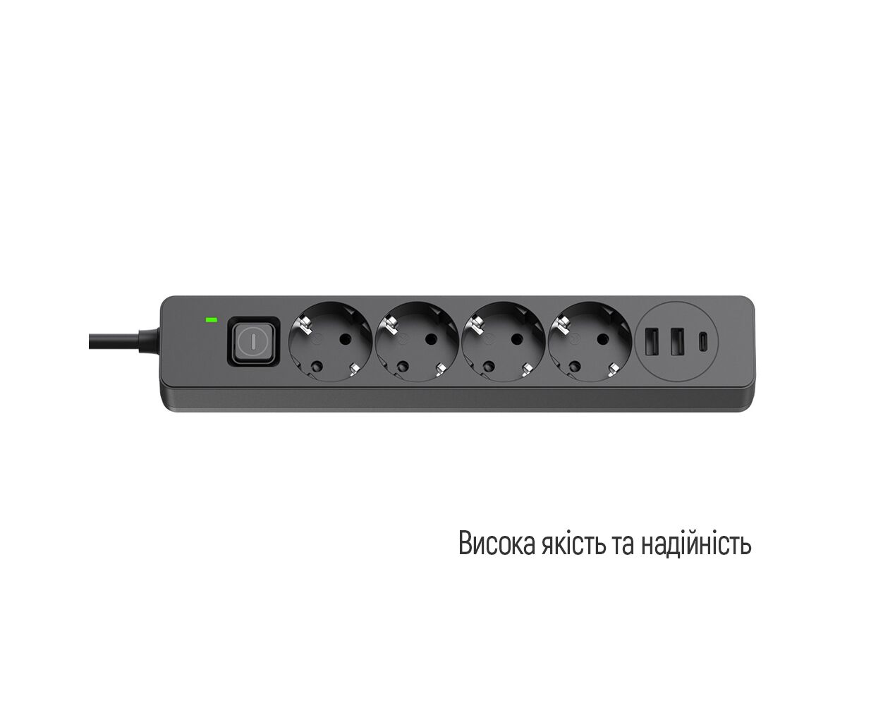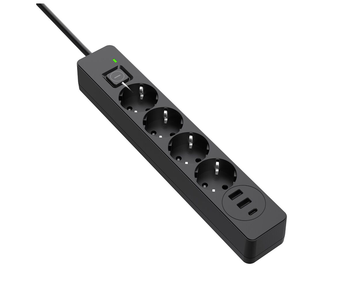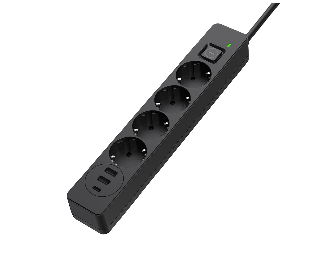 Суммарная мощность подключенной нагрузки - ≤ 2500 Вт, Количество розеток - 4 шт, 2 USB, 1 USB Type-C, розетки с защитными шторками, Quick Charge 3, Длина кабеля - 5 м, Цвет - черный