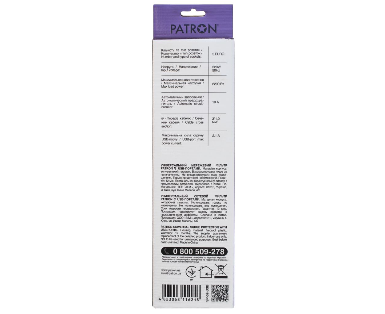 Характеристики Сетевой фильтр питания Patron 1.8m + 2 USB 2.0, 2.1A, 5 роз. White (EXT-PN-SP-52-USB-W)
