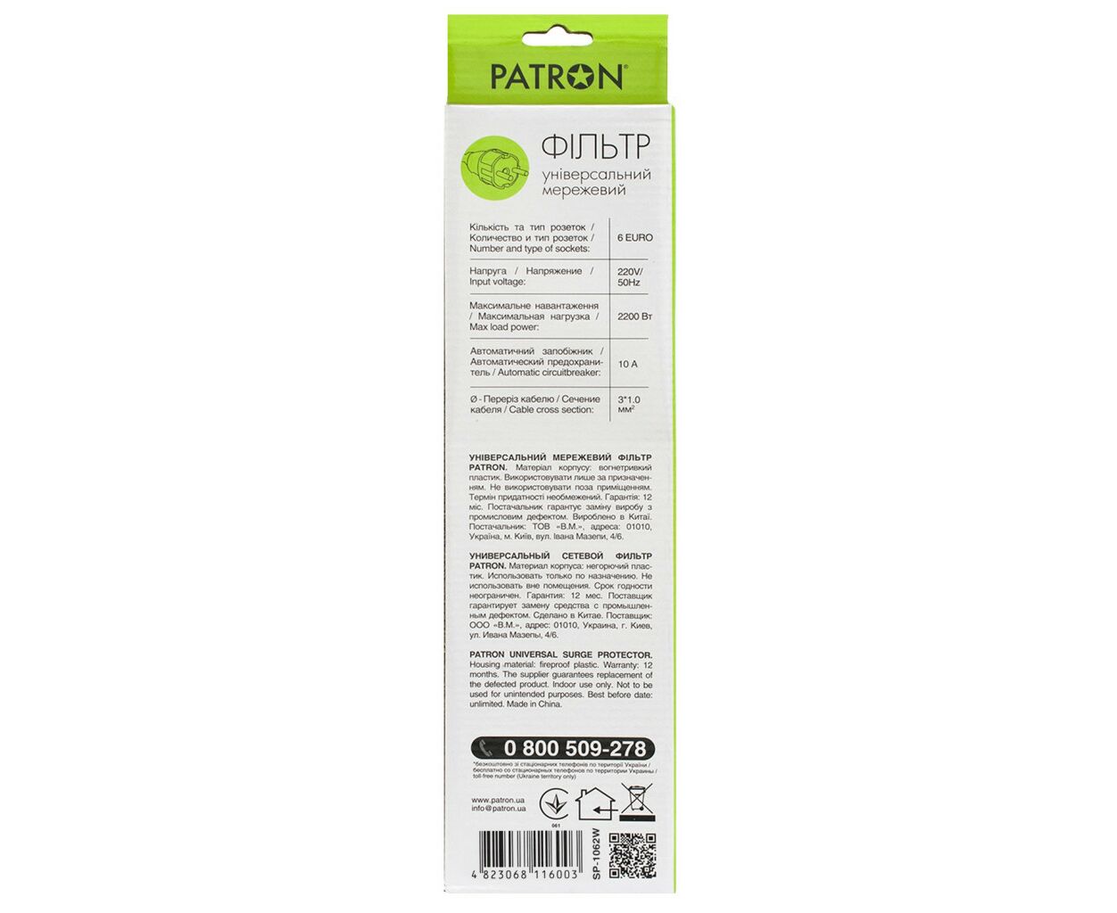 Характеристики Сетевой фильтр питания Patron 1.8m (SP-1062W), 6 розеток White (EXT-PN-SP-1062W)
