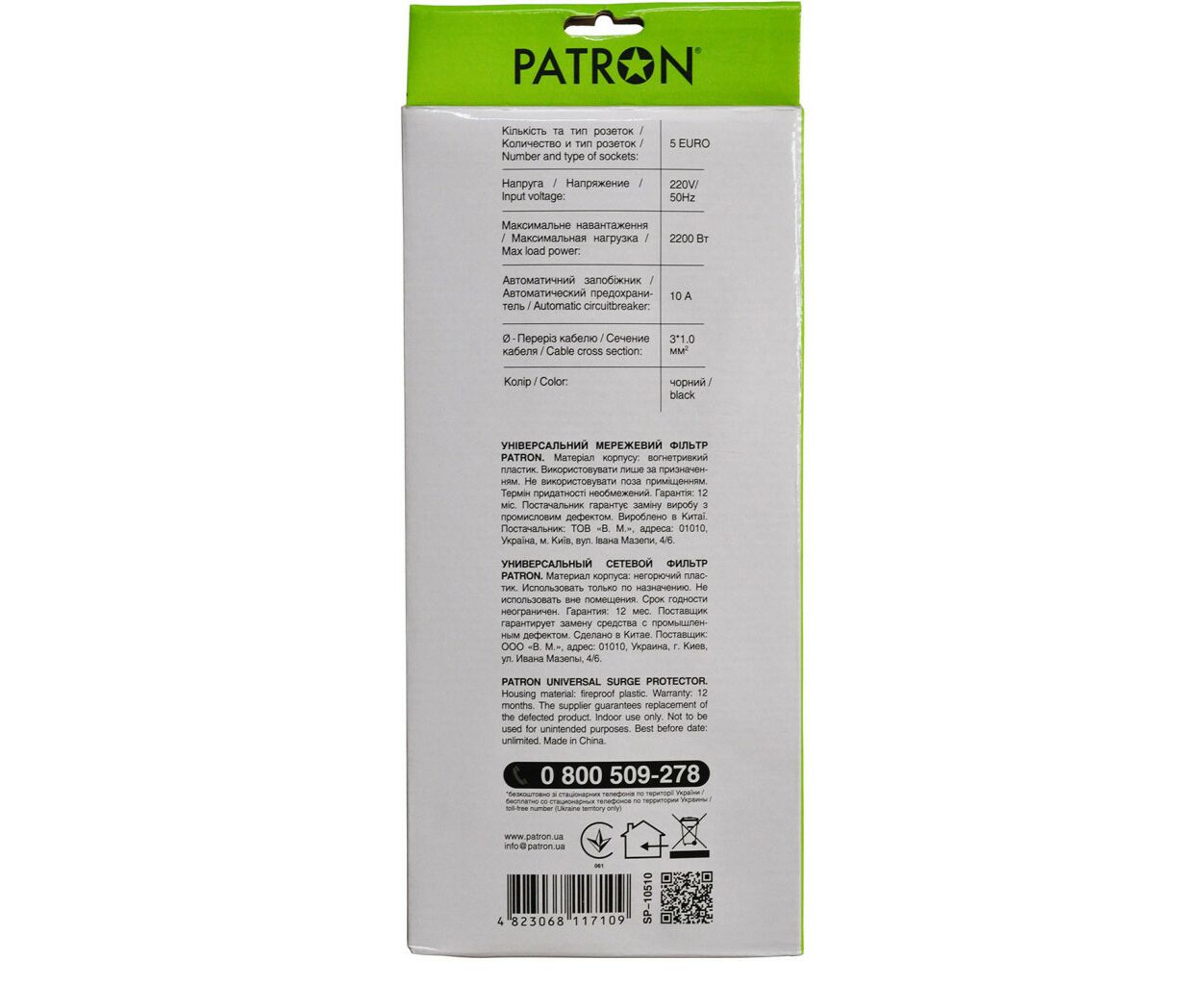 Характеристики Сетевой фильтр питания Patron 10 m3*1mm2 (SP-10510) 5 розеток BLACK (EXT-PN-SP-10510)