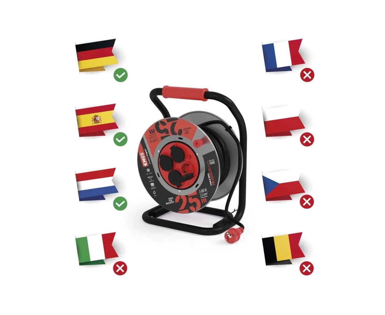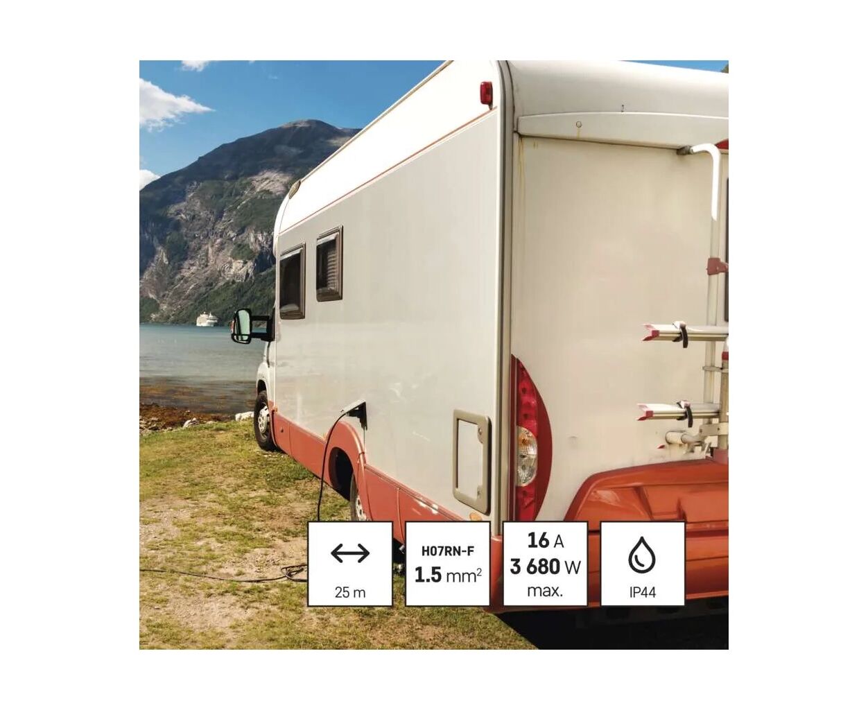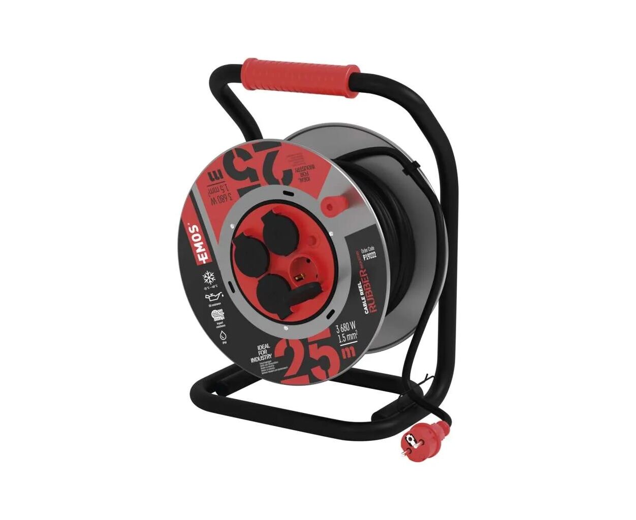 Тип - удлинитель, Суммарная мощность подключенной нагрузки - < 3680 Вт, Количество розеток - 4 шт, Длина кабеля - 25 м, заземление - есть, защита - IP44, Цвет - черный