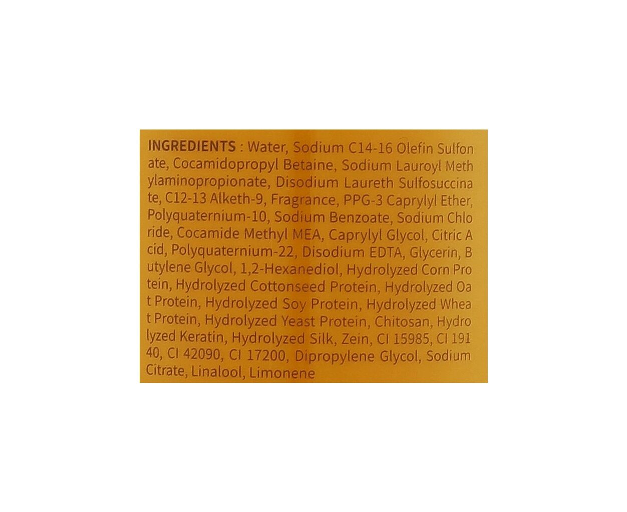 - Water, Sodium C14-16 Olefin Sulfonate, Cocamidopropyl Betaine, Sodium Lauroyl, Methylaminopropionate, Disodium Laureth Sulfosuccinate, C12-13 Alketh-9, PPG-3 Caprylyl Ether, Fragrance, Polyquaternium-10, Sodium Benzoate, Sodium Chloride, Cocamide Methyl M