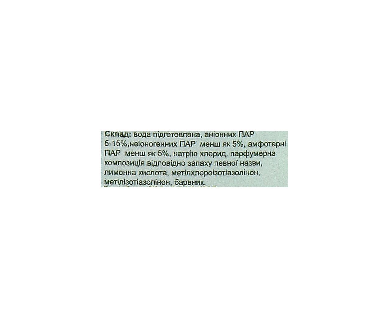 • Prepared water, anionic surfactants 5-15%, nonionic surfactants less than 5%, amphoteric surfactants less than 5%, sodium chloride, perfume composition, citric acid, methylchloroisothiazolinone, methylisothiazolinone, dye. TUU 20.4-20021056-019:2019