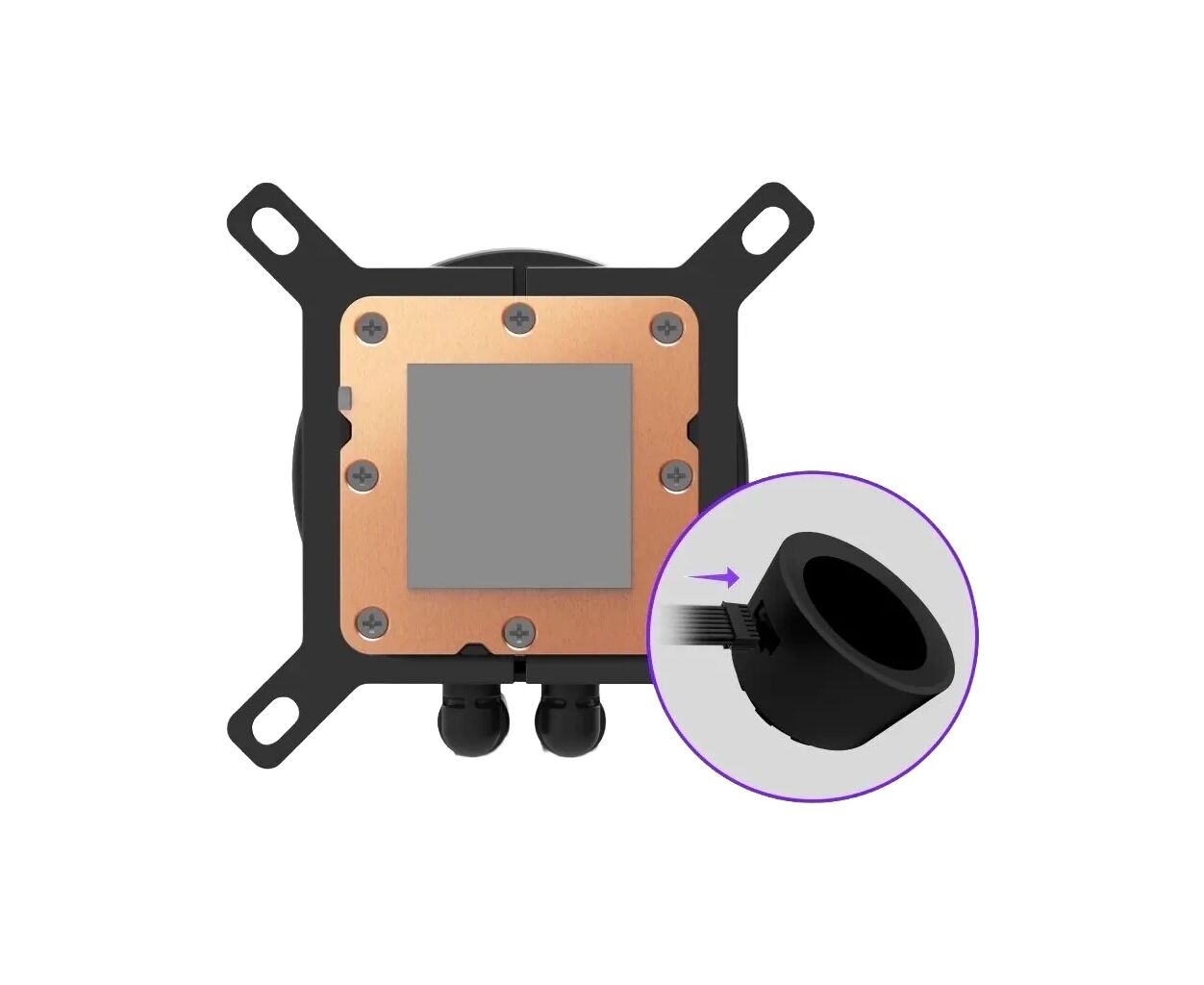 - Оптимизированная холодная пластина: медная холодная пластина с разделенным потоком направляет охлаждающую жидкость в самые горячие участки процессора для лучшего теплообмена, снижения температуры и более стабильной тепловой производительности.