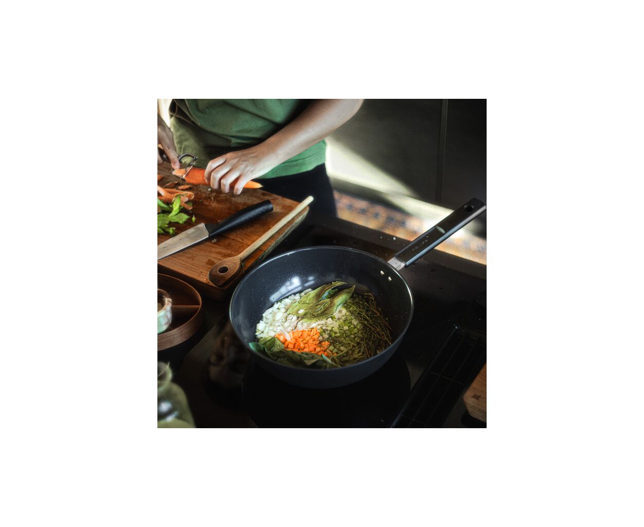 - Сковорода изготовлена из сотни процентов переработанного алюминия, что обеспечивает однородное распределение тепла.