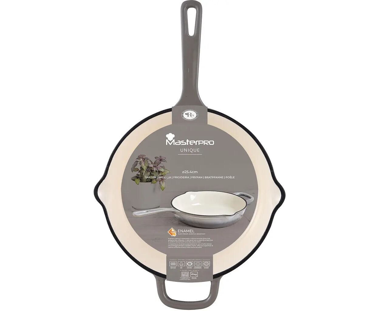 Тип сковороды - традиционная, Unique, Форма - круглая, 25 см, Материал - чугун, Тип внутреннего покрытия - ENAMEL, Совместимость с плитами - газовые плиты, электрические плиты, керамические плиты, крышка отсутствует, серый