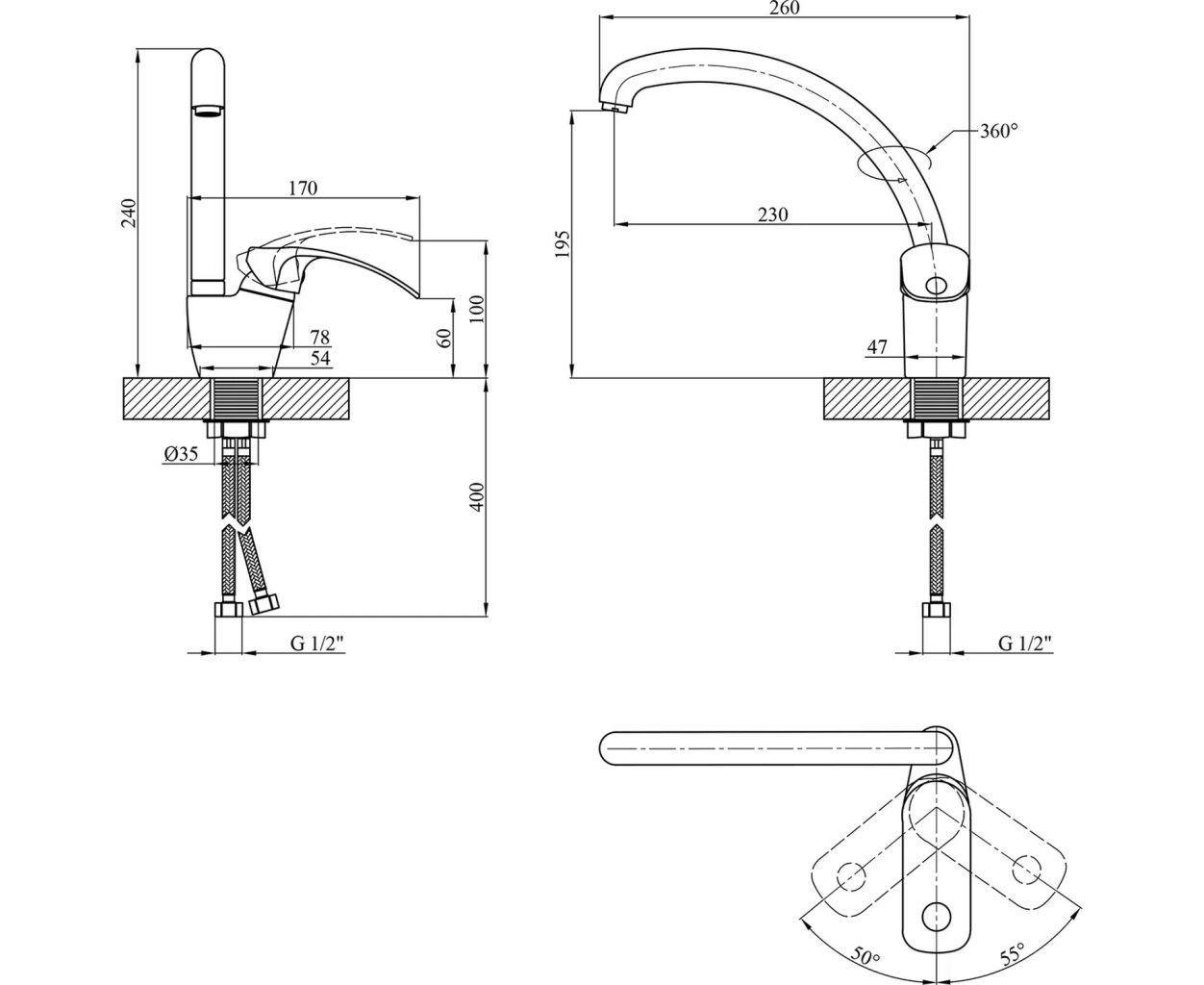 однорычажный, врезной, латунь, поворотный, Длина излива - 23 см, Подключение - 1/2", Цвет - серебристый, Германия