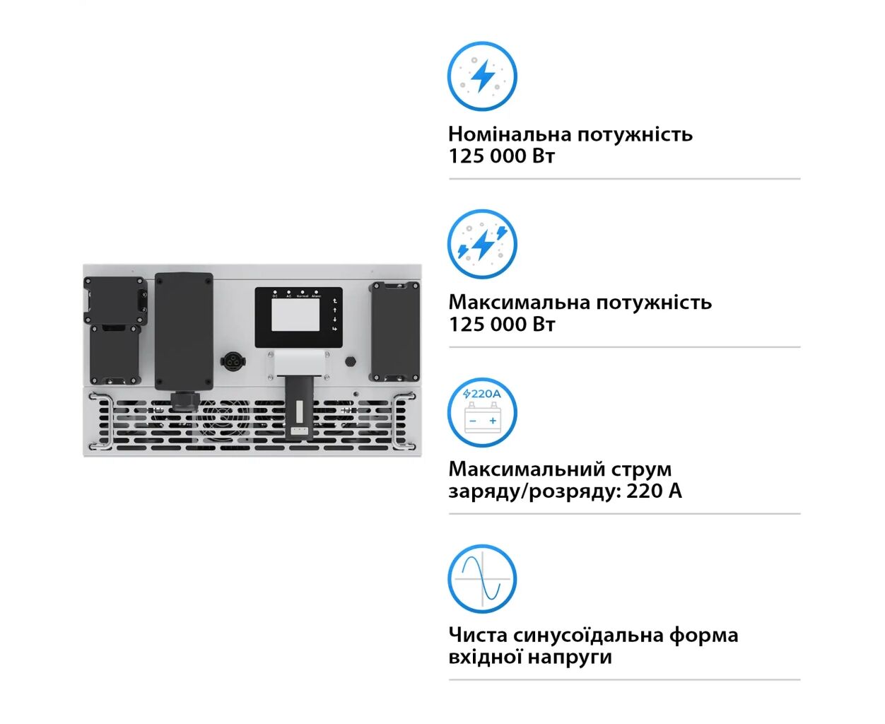 гибридный, 3 фазы, Мощность инвертора (активная) - 125 кВт, 125 кВ·А, 200 А, 98.5%, 5-95% относительной влажности (без конденсации), вентилятор, 775 x 543 x 310 мм