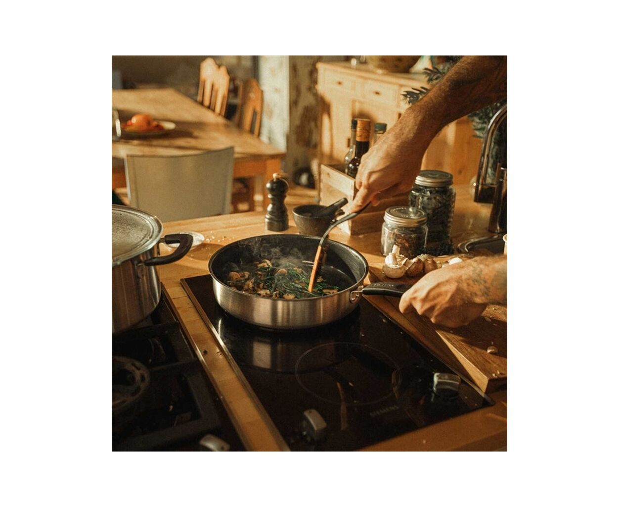 Сковорода размером 26 см изготовлена на 90% из переработанной нержавеющей стали и может использоваться на всех плитах, включая индукционные. Антипригарное керамическое покрытие Ceratec, которое не содержит пластика, легко чистится и можно мыть в посудомоечной машине.