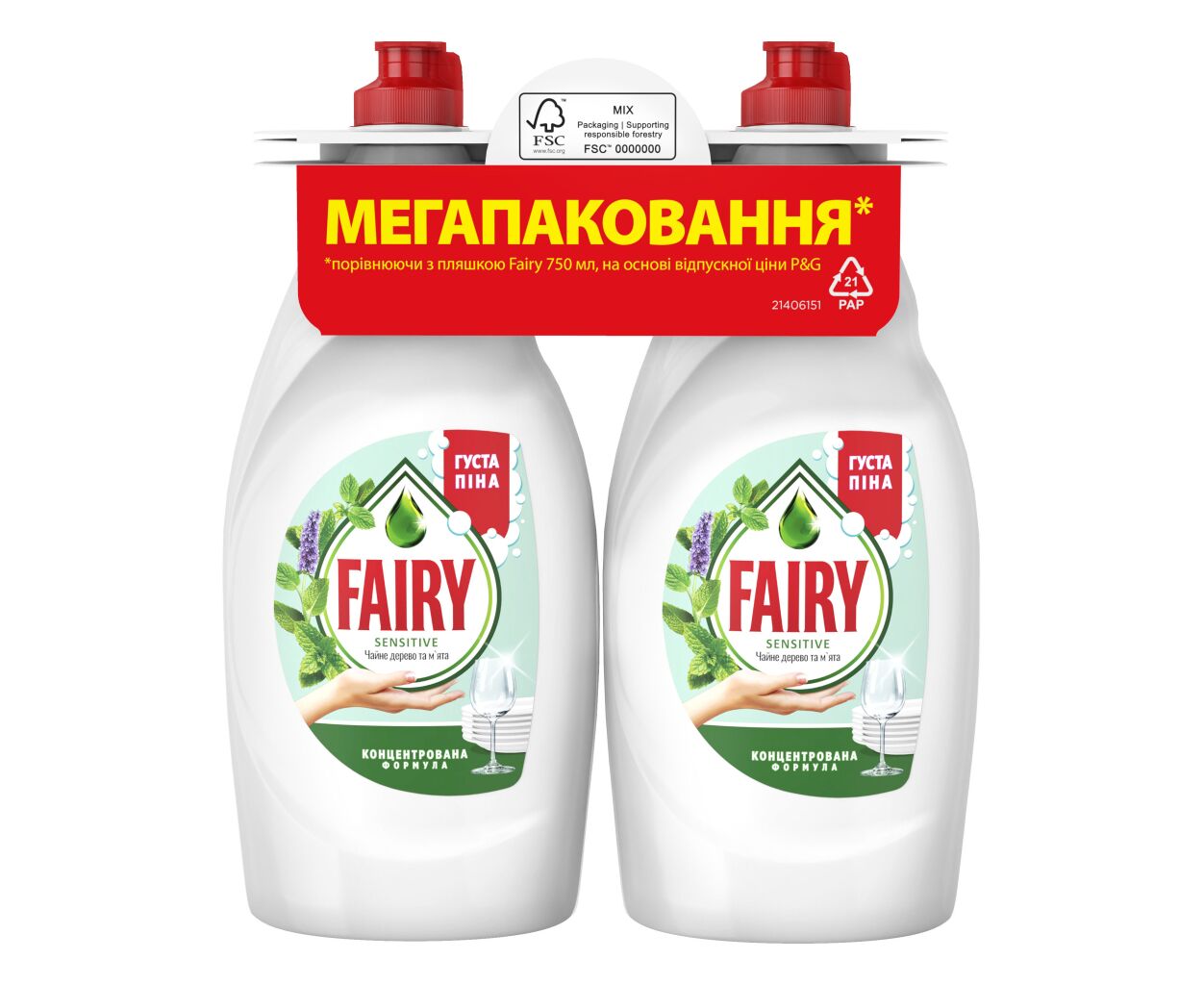 Описание Средство для ручного мытья посуды Fairy Sensitive Чайное дерево и мята 2 х 750 мл (8006530224956)