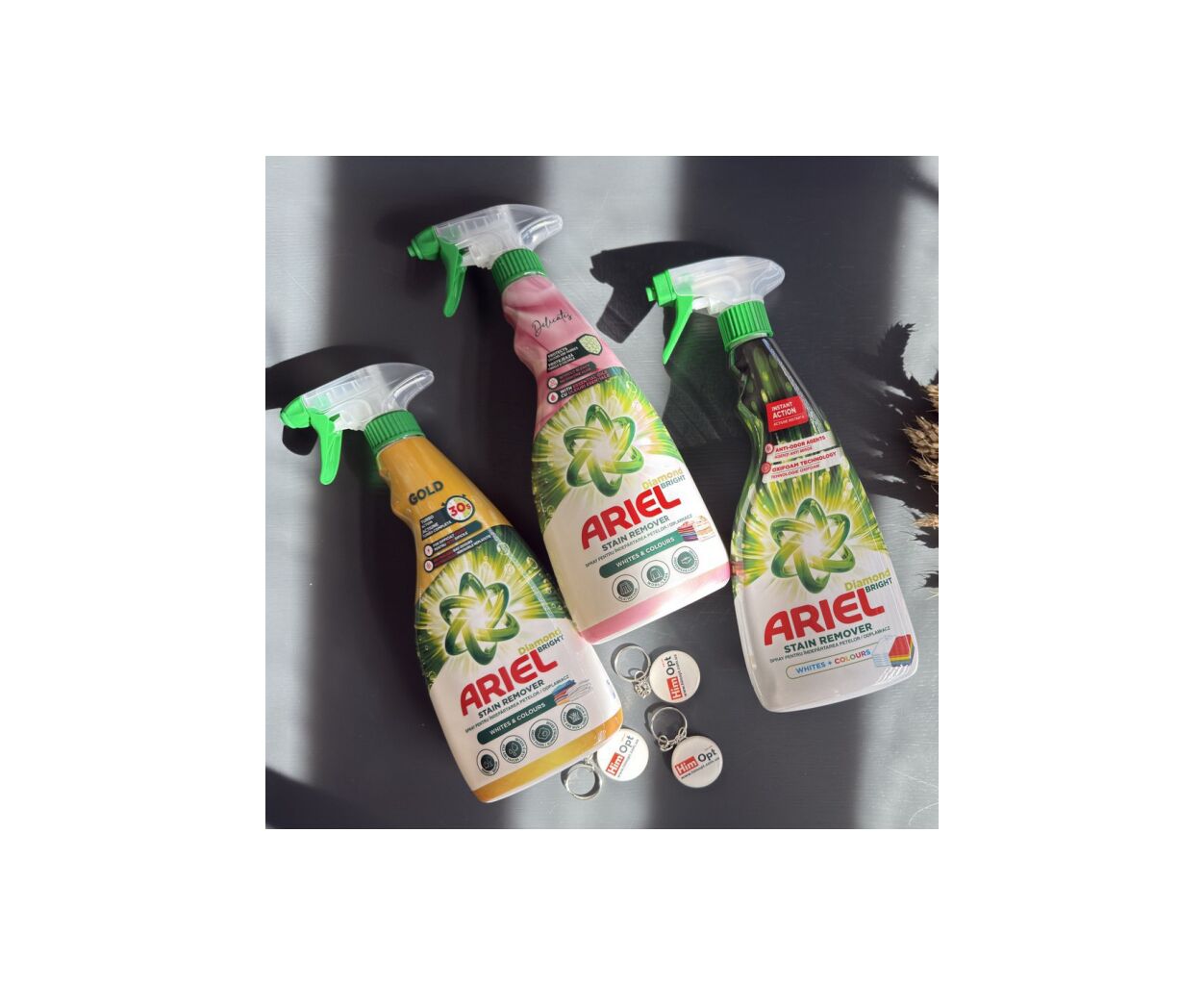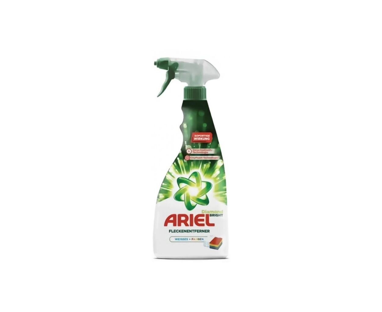 - ARIEL Spay для удаления пятен. Он основывается на технологии Oxifoam. Продукт богат поверхностно-активными веществами и ферментами для удаления сложных пятен, содержит отбеливающие и исключительные средства для получения идеального белого и яркого цвета,
